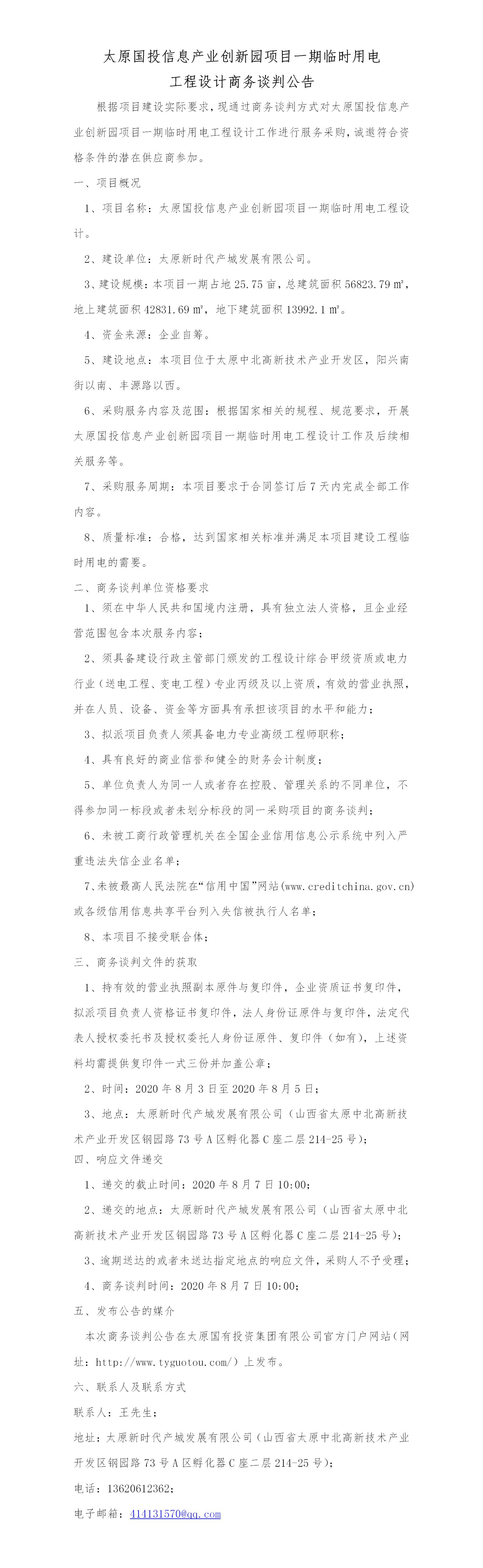 太原國投信息產(chǎn)業(yè)創(chuàng)新園項目一期臨時用電工程設(shè)計商務(wù)談判公告