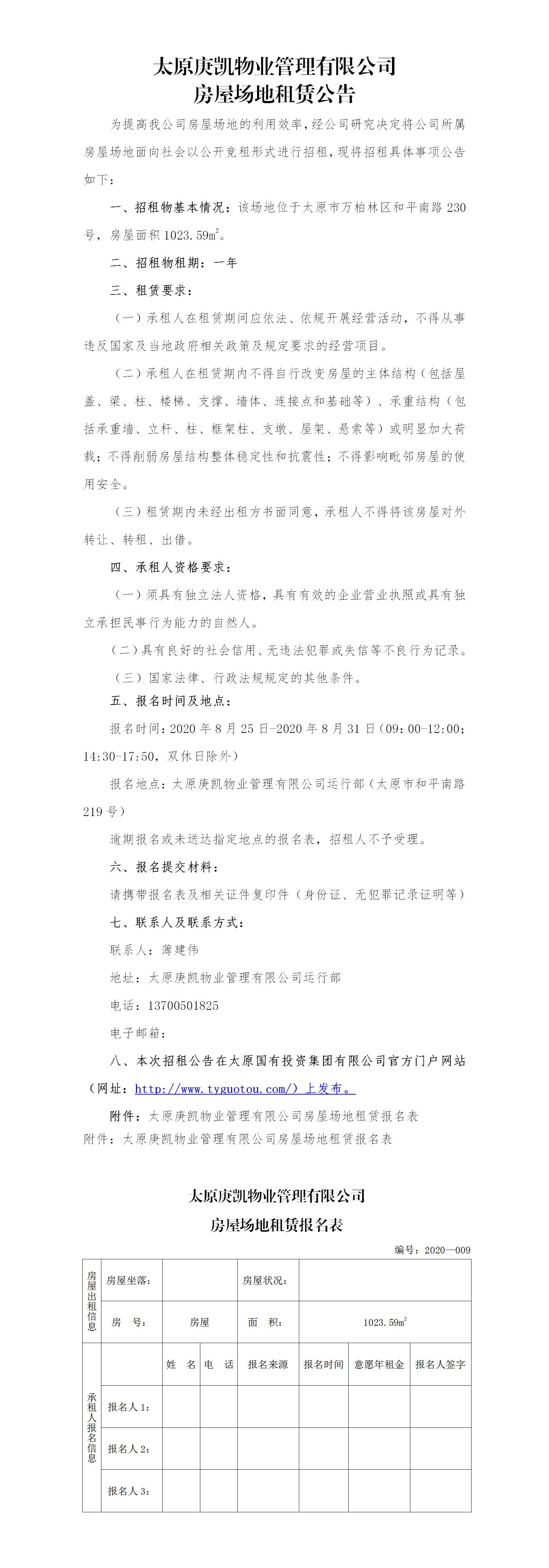 太原庚凱物業(yè)管理有限公司房屋場地租賃公告(九)