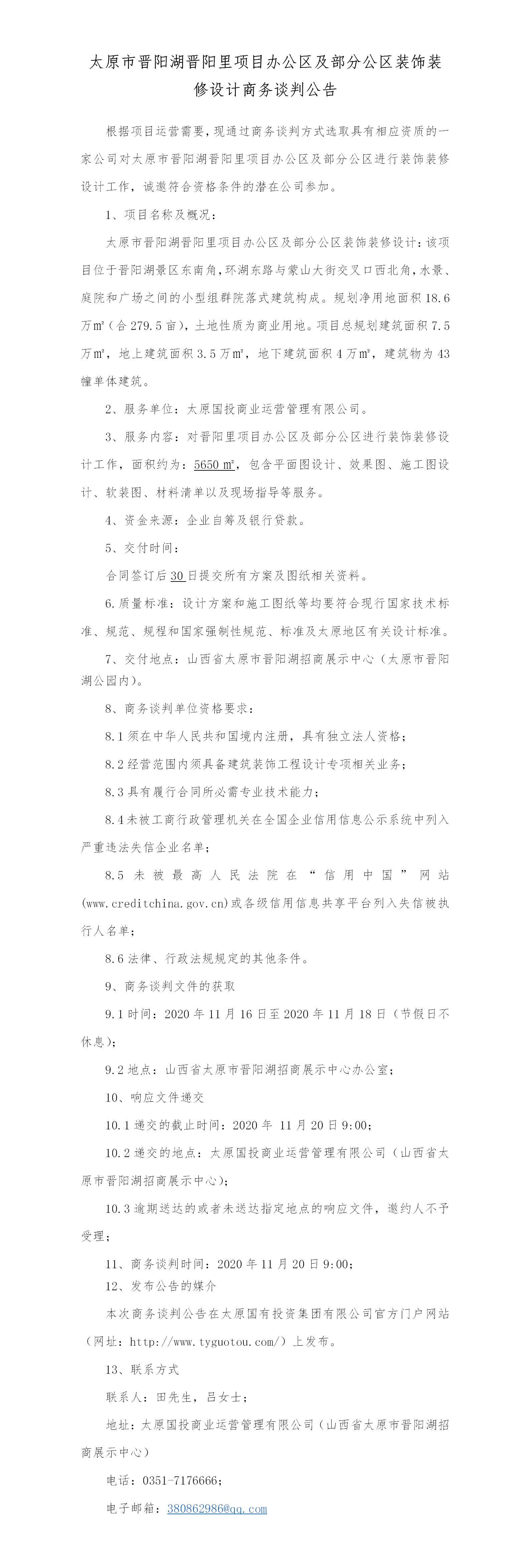 太原市晉陽湖晉陽里項(xiàng)目辦公區(qū)及部分公區(qū)裝飾裝修設(shè)計(jì)商務(wù)談判公告
