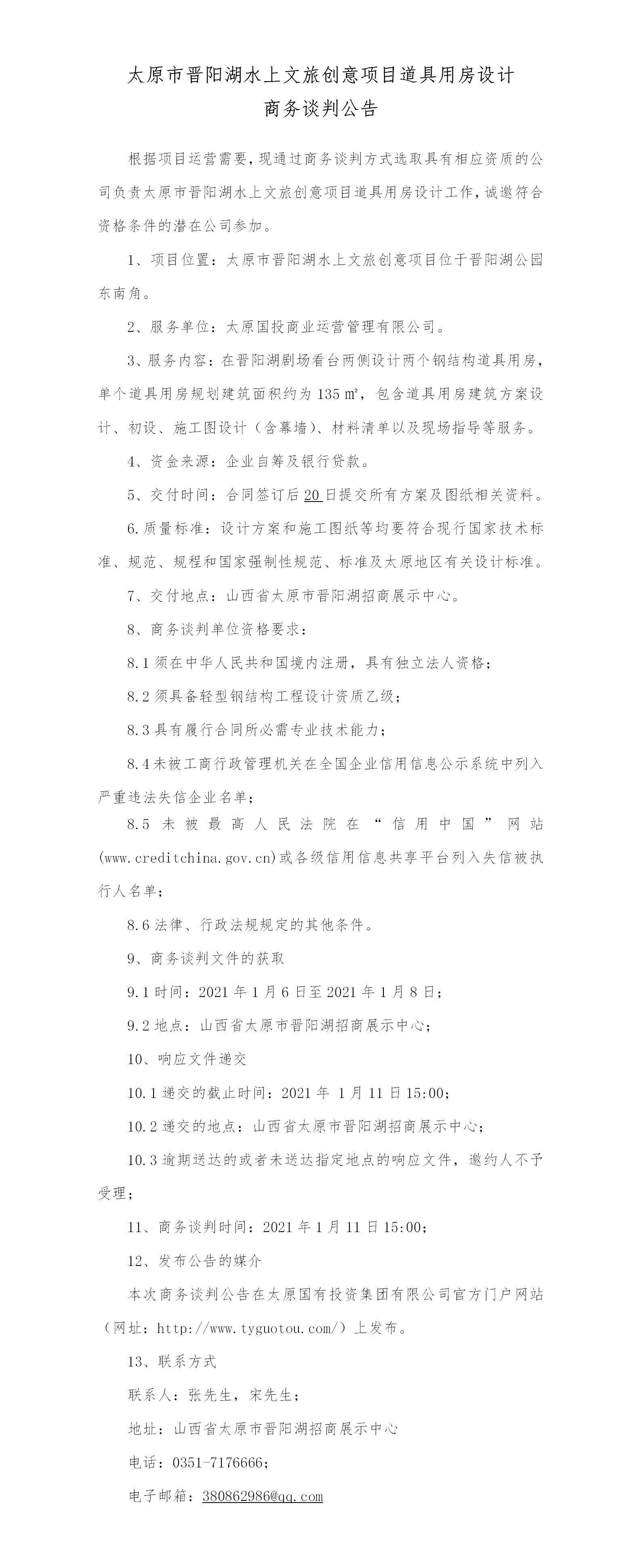 太原市晉陽湖水上文旅創(chuàng)意項(xiàng)目道具用房設(shè)計(jì)商務(wù)談判公告