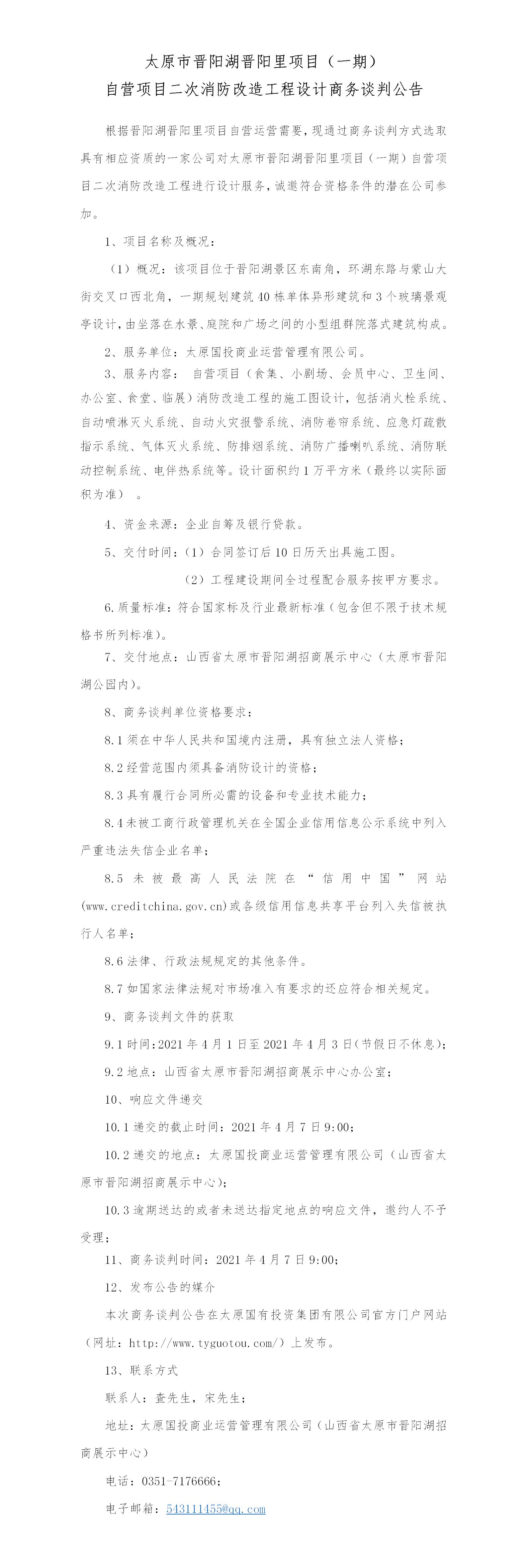 晉陽湖晉陽里項目消防改造工程設(shè)計商務(wù)談判公告
