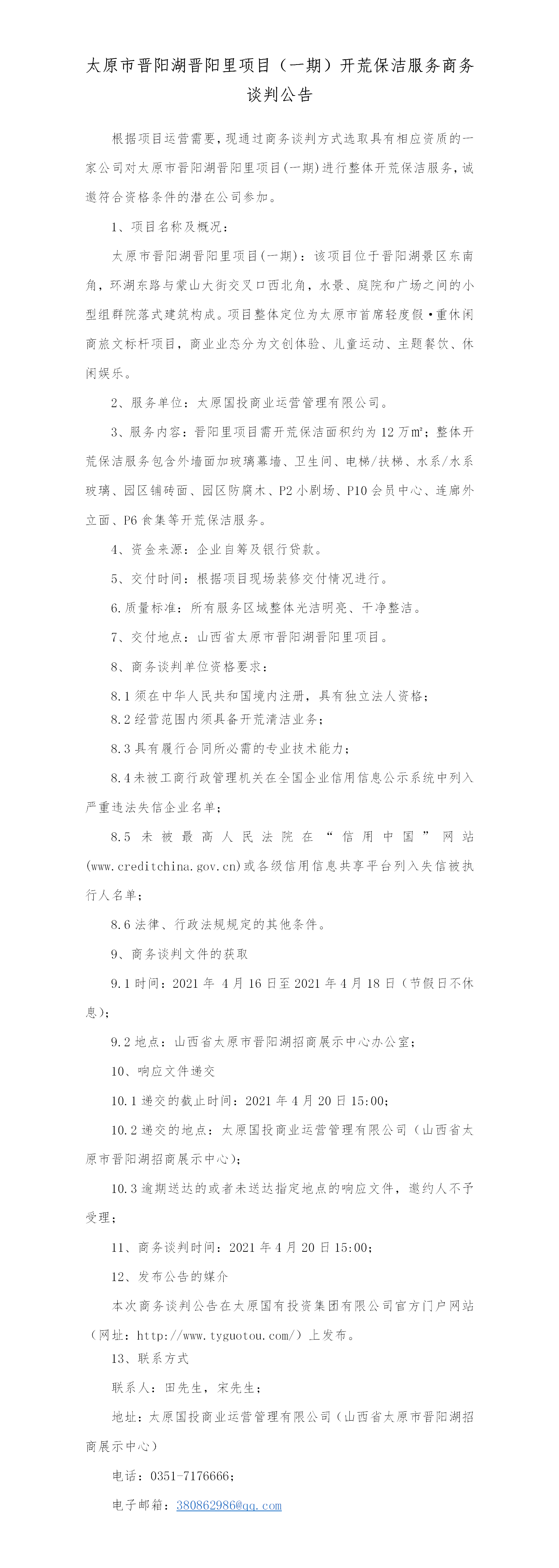 太原市晉陽(yáng)湖晉陽(yáng)里項(xiàng)目(一期)開(kāi)荒保潔服務(wù)商務(wù)談判公告