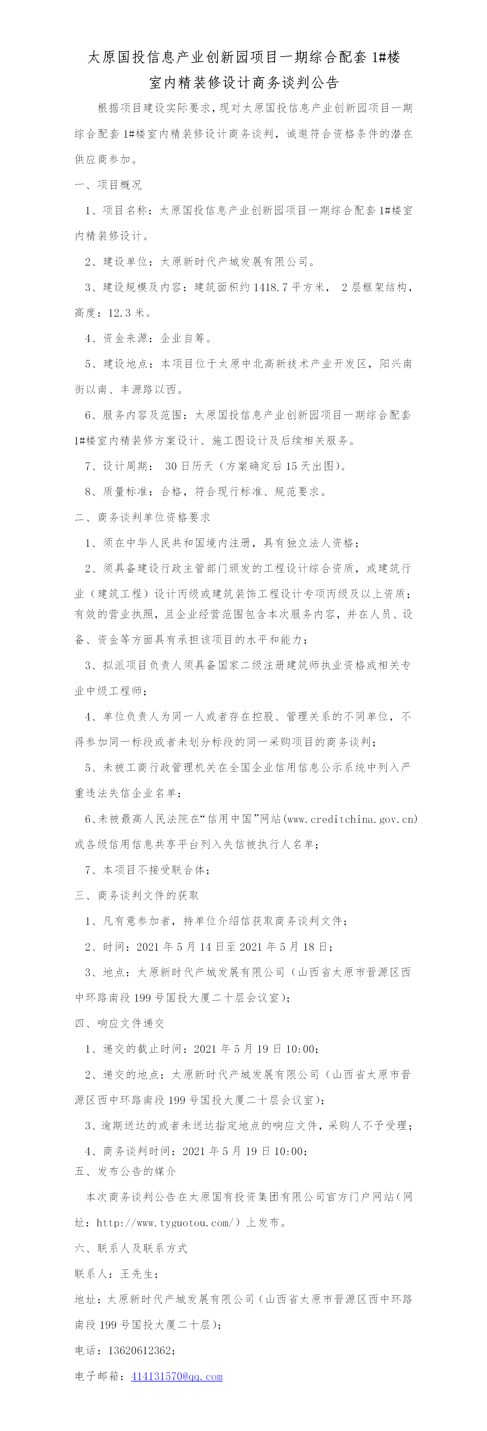 太原國(guó)投信息產(chǎn)業(yè)創(chuàng)新園項(xiàng)目一期綜合配套1#樓室內(nèi)精裝修設(shè)計(jì)商務(wù)談判公告