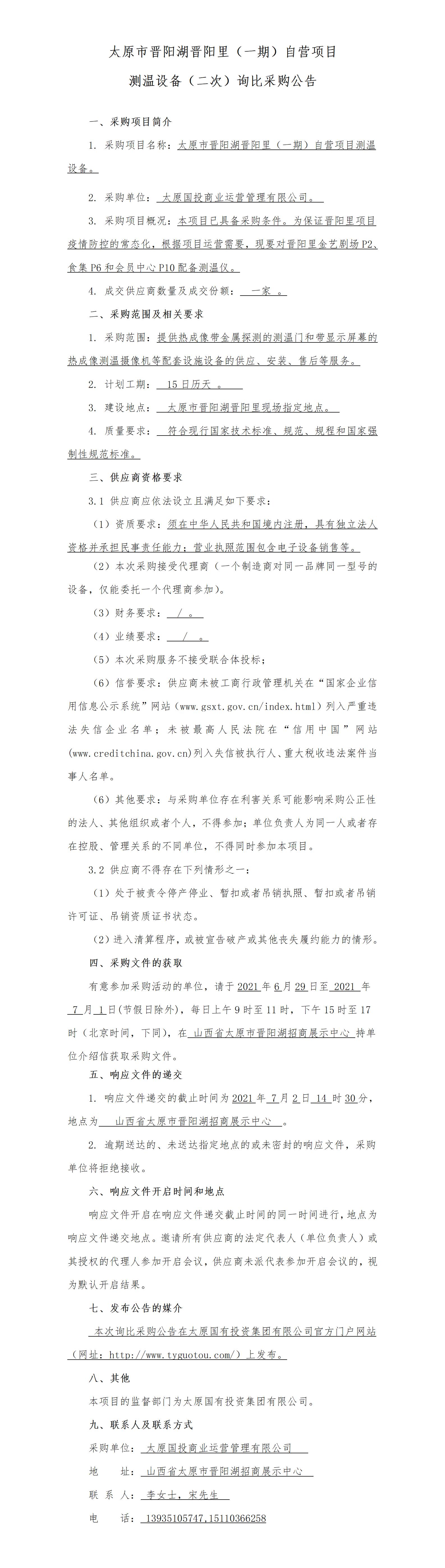 太原市晉陽湖晉陽里(一期)自營(yíng)項(xiàng)目測(cè)溫設(shè)備詢比采購公告(二次)