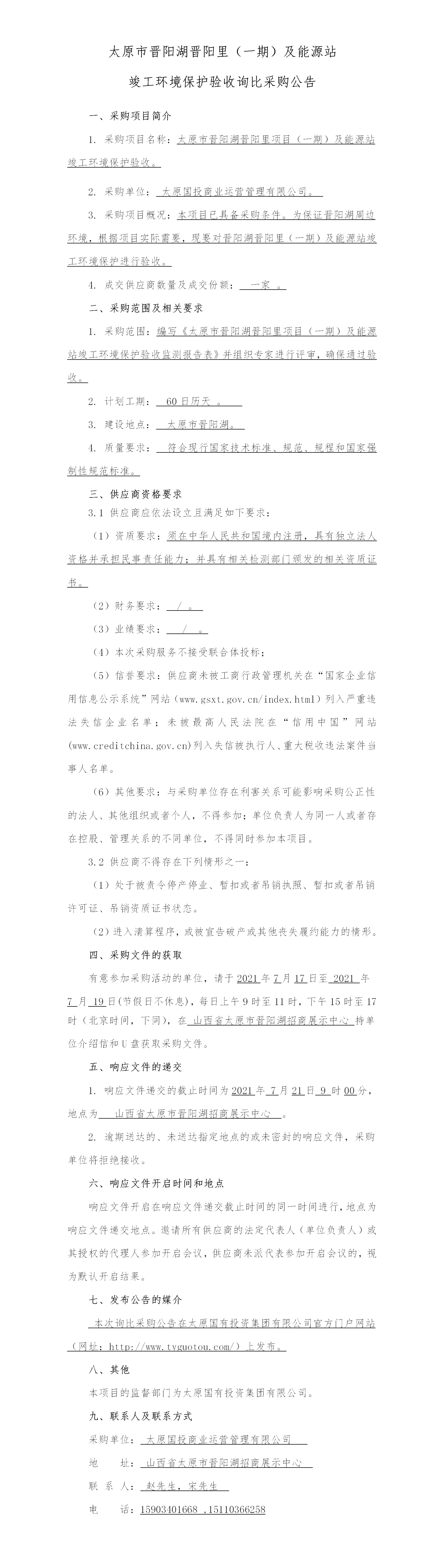 太原市晉陽湖晉陽里(一期)及能源站竣工環(huán)境保護(hù)驗(yàn)收詢比采購公告