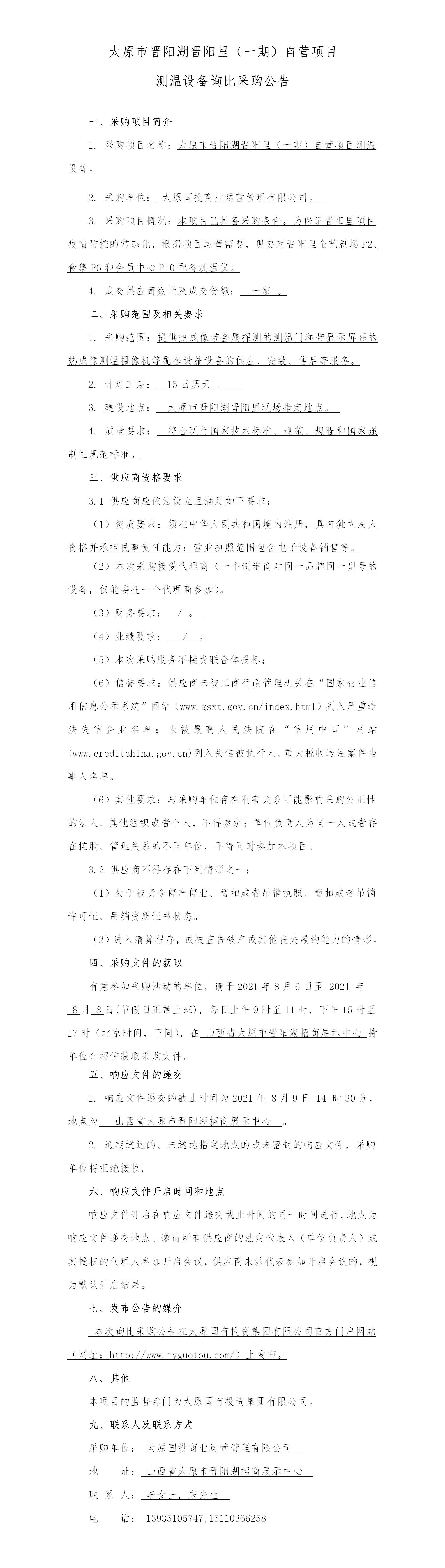 太原市晉陽湖晉陽里(一期)自營項目測溫設備詢比采購公告
