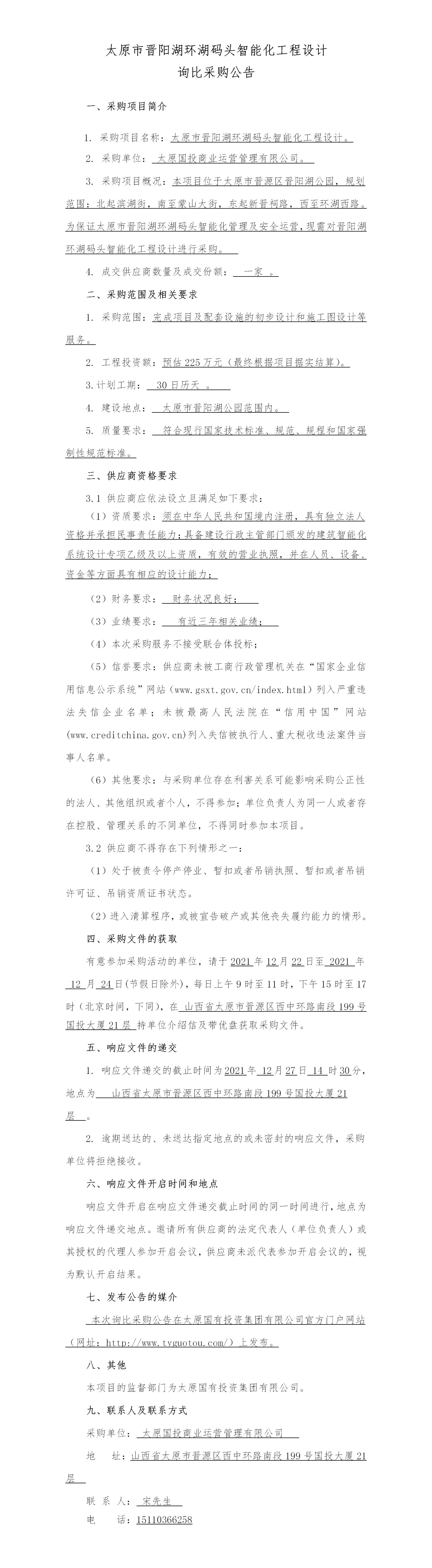 太原市晉陽(yáng)湖環(huán)湖碼頭智能化工程設(shè)計(jì)詢比采購(gòu)公告