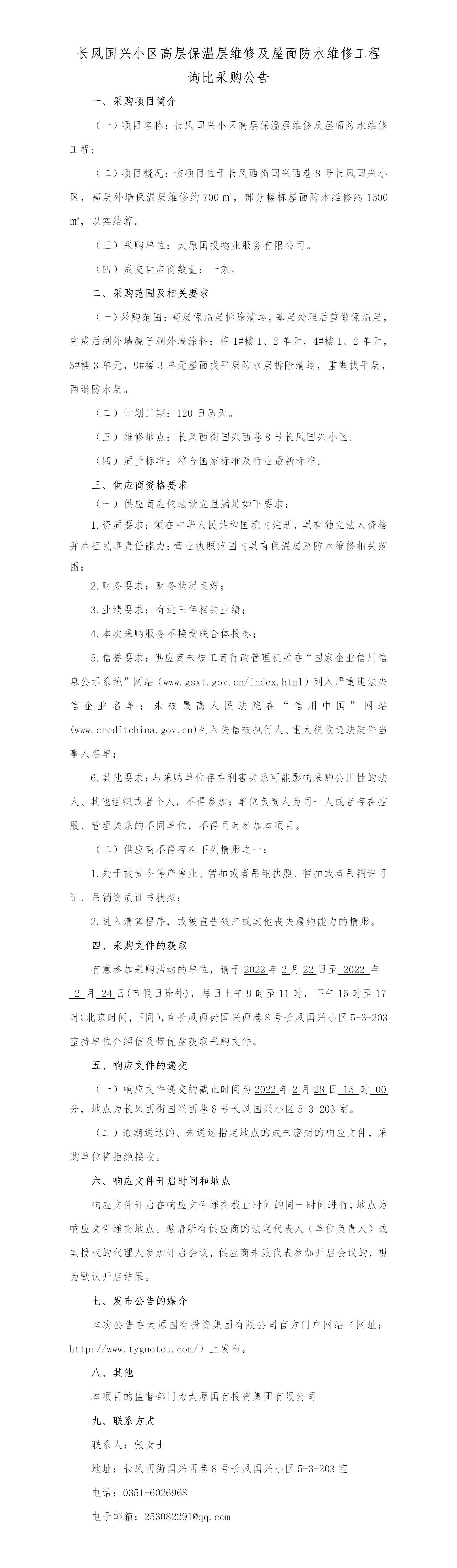 長風國興小區(qū)高層保溫層維修及屋面防水維修工程詢比采購公告