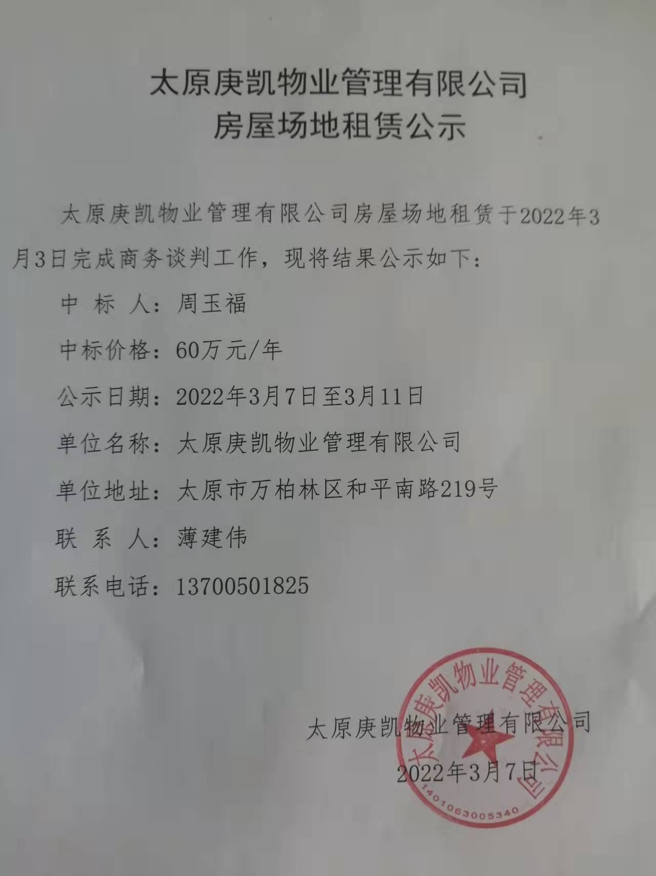 太原庚凱物業(yè)管理有限公司房屋場(chǎng)地租賃公示