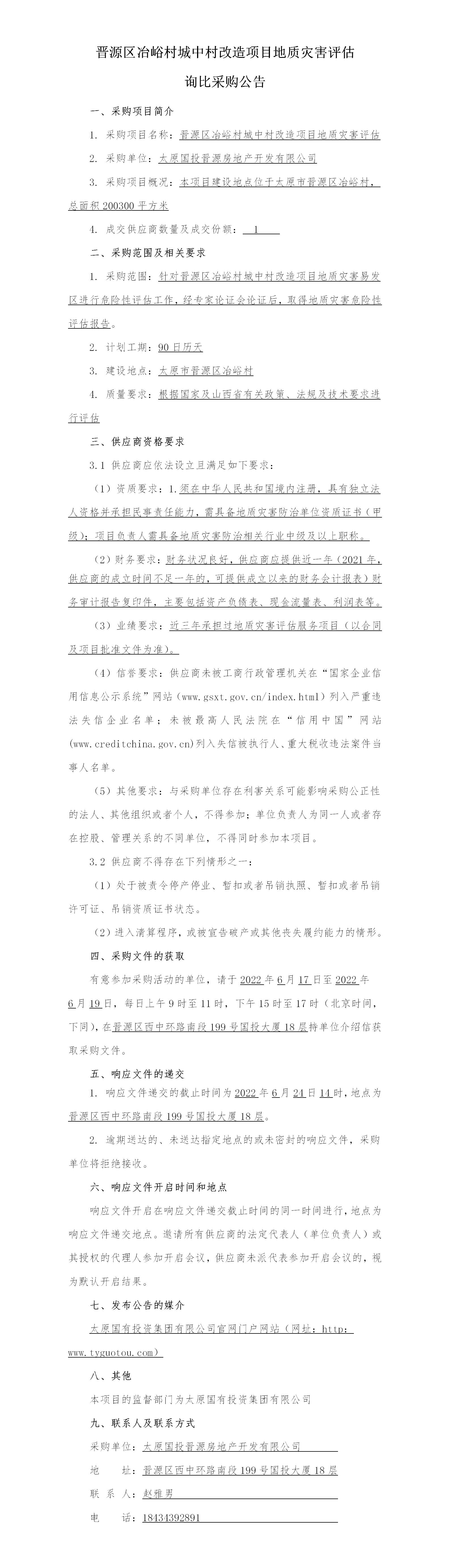 晉源區(qū)冶峪村城中村改造項目地質災害評估詢比采購公告