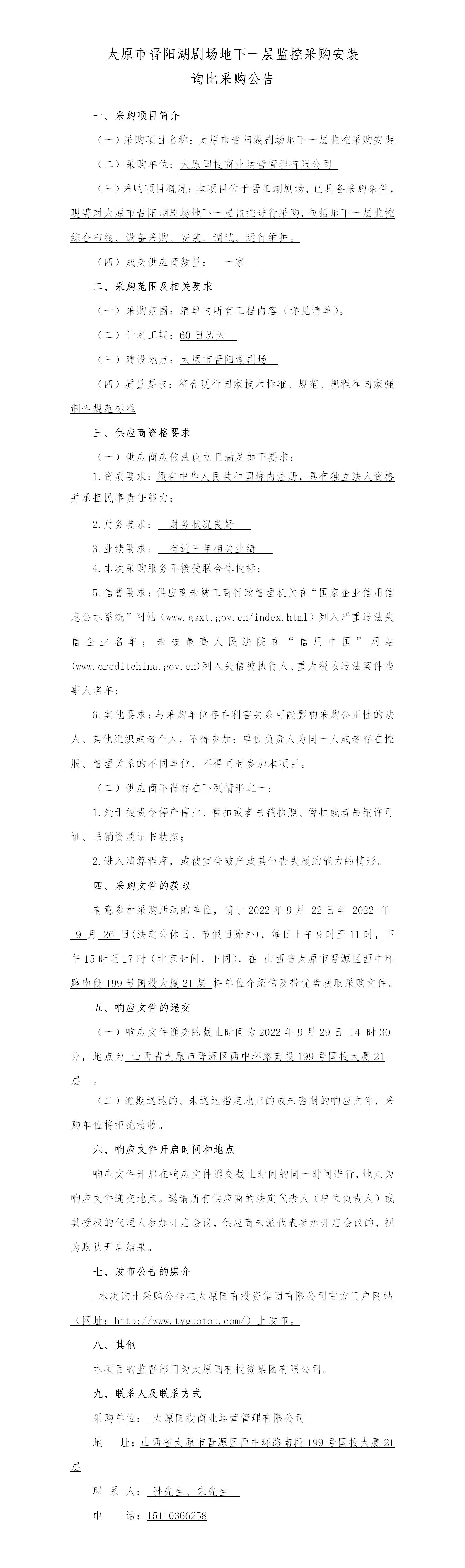 太原市晉陽湖劇場地下一層監(jiān)控詢比采購公告