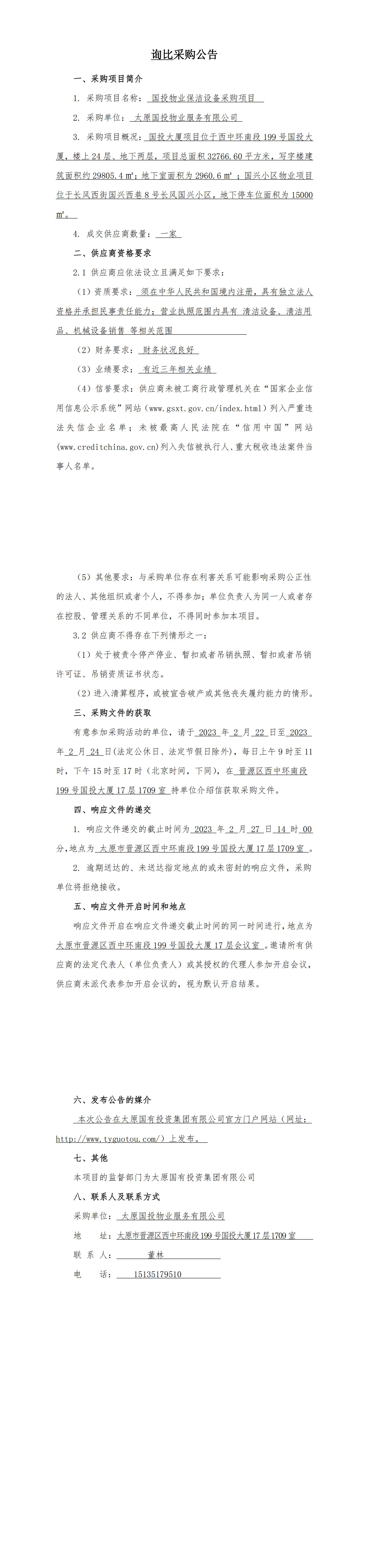 太原國投物業(yè)保潔設備采購項目詢比采購公告