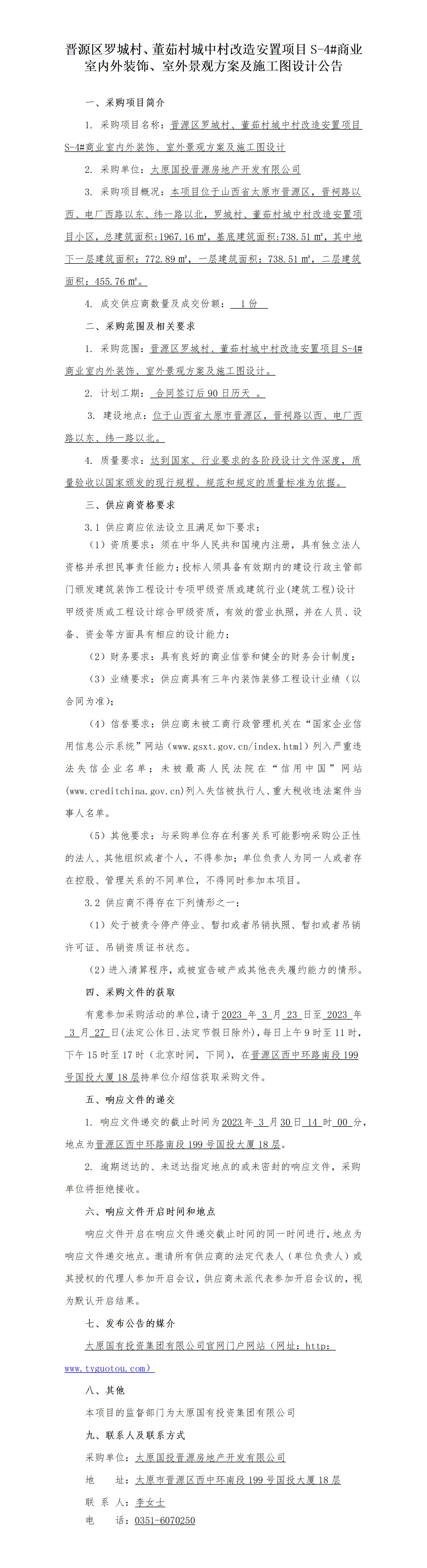 晉源區(qū)羅城村、董茹村城中村改造安置項目S-4#商業(yè)室內(nèi)外裝飾、室外景觀方案及施工圖設計公告