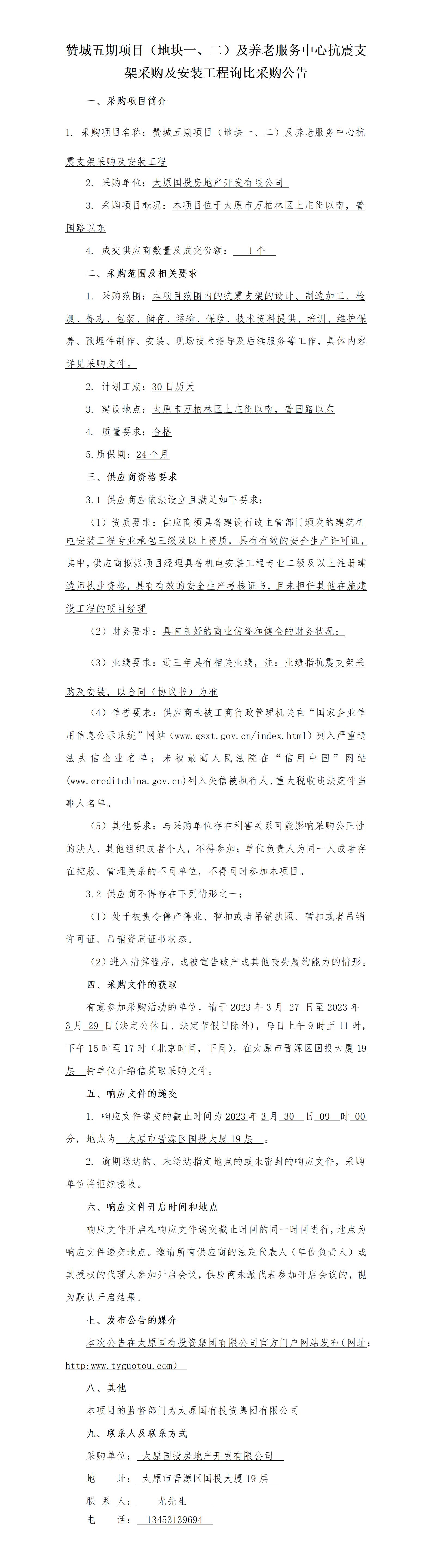 贊城五期項(xiàng)目(地塊一、二)及養(yǎng)老服務(wù)中心抗震支架采購(gòu)及安裝工程詢比采購(gòu)公告