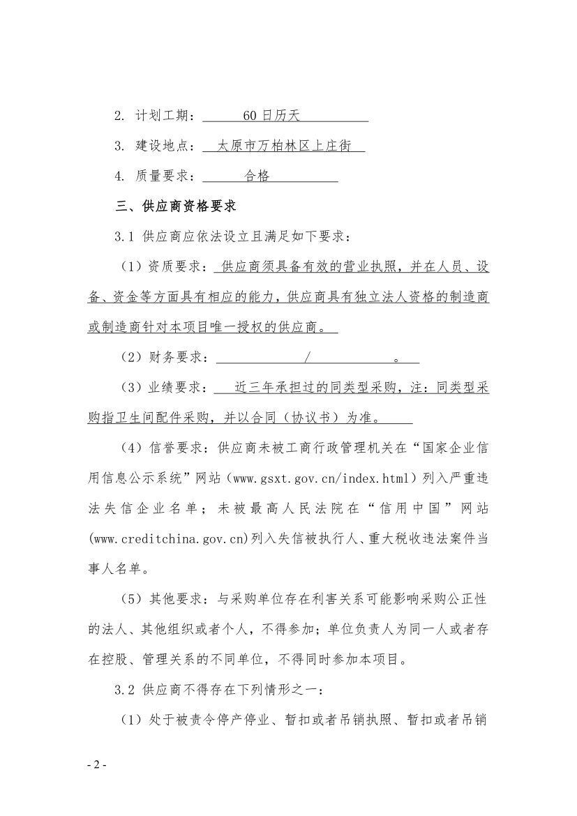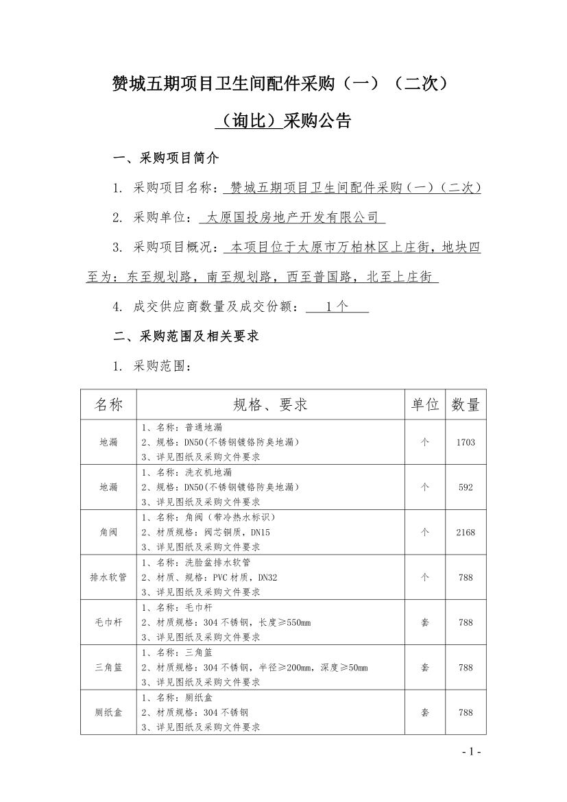 贊城五期項目衛(wèi)生間配件采購(一)(二次)(詢比)采購公告