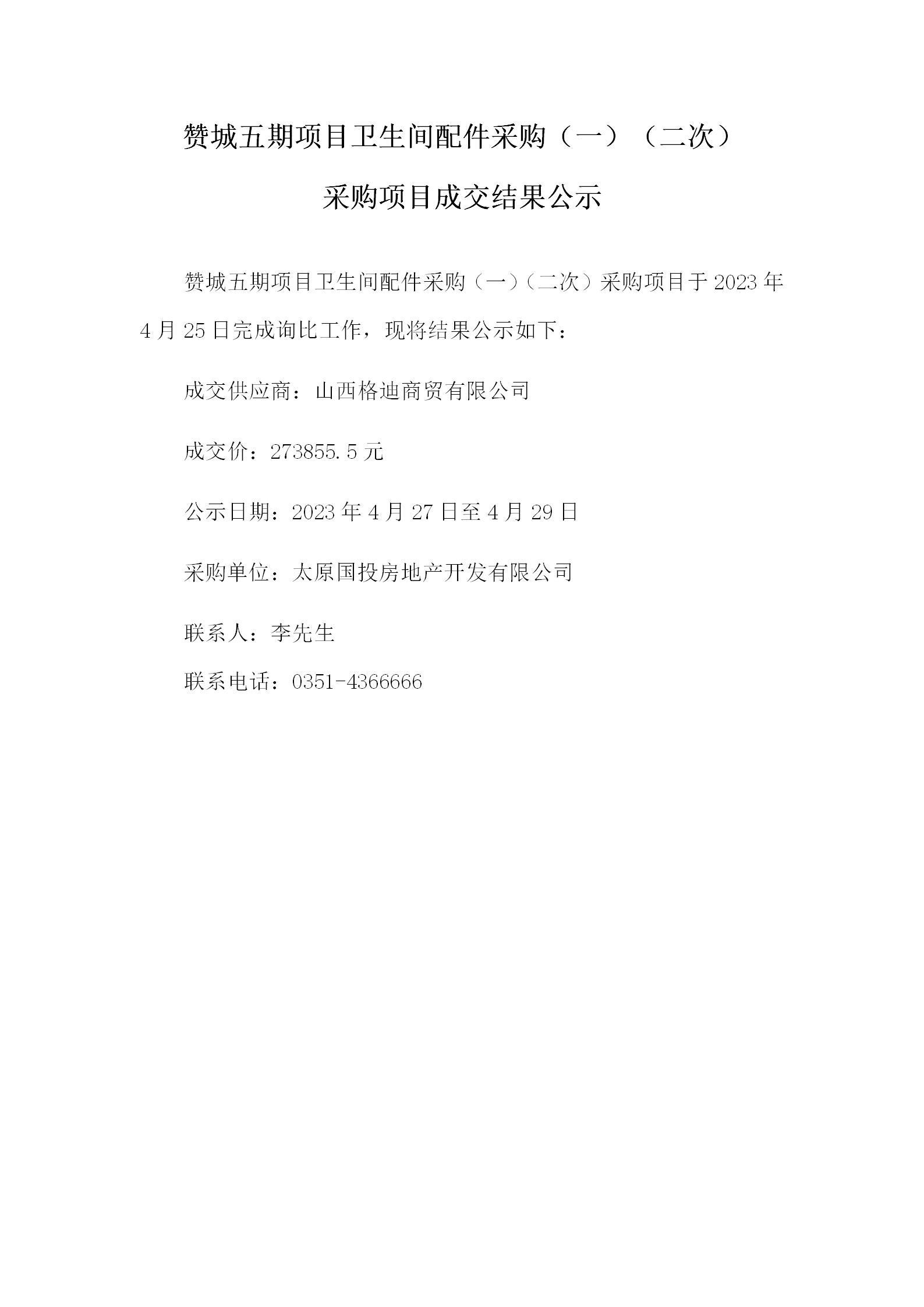 贊城五期項(xiàng)目衛(wèi)生間配件采購(gòu)(一)(二次)采購(gòu)項(xiàng)目成交結(jié)果公示