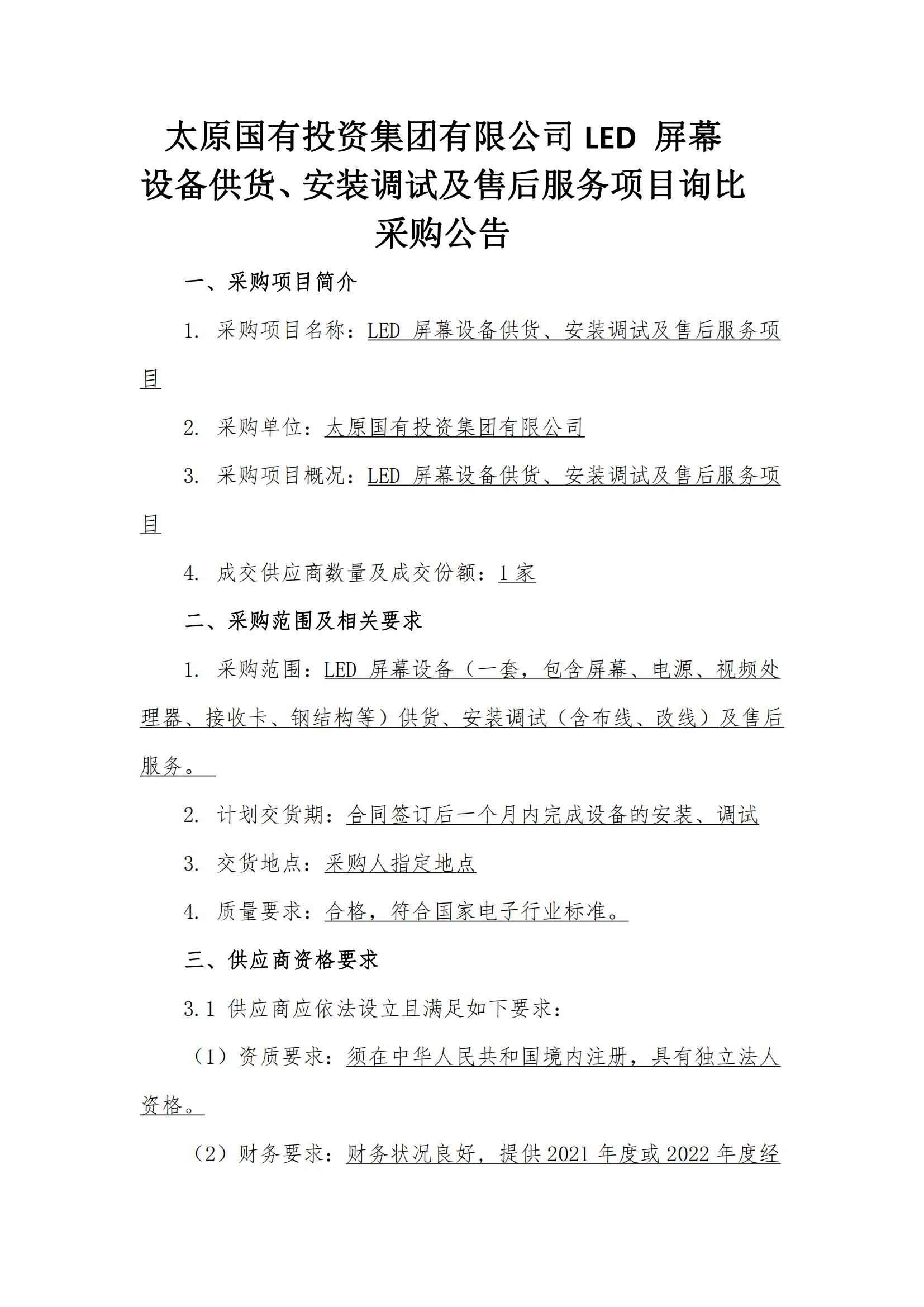太原國有投資集團(tuán)有限公司LED 屏幕 設(shè)備供貨、安裝調(diào)試及售后服務(wù)項(xiàng)目詢比采購公告