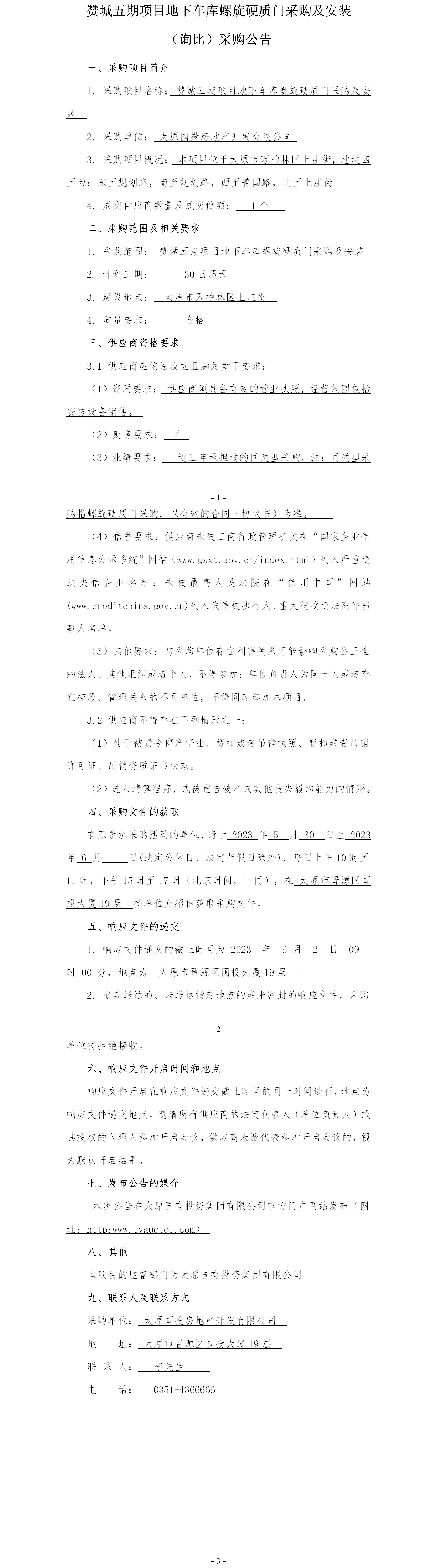 贊城五期項目地下車庫螺旋硬質(zhì)門采購及安裝詢比采購公告