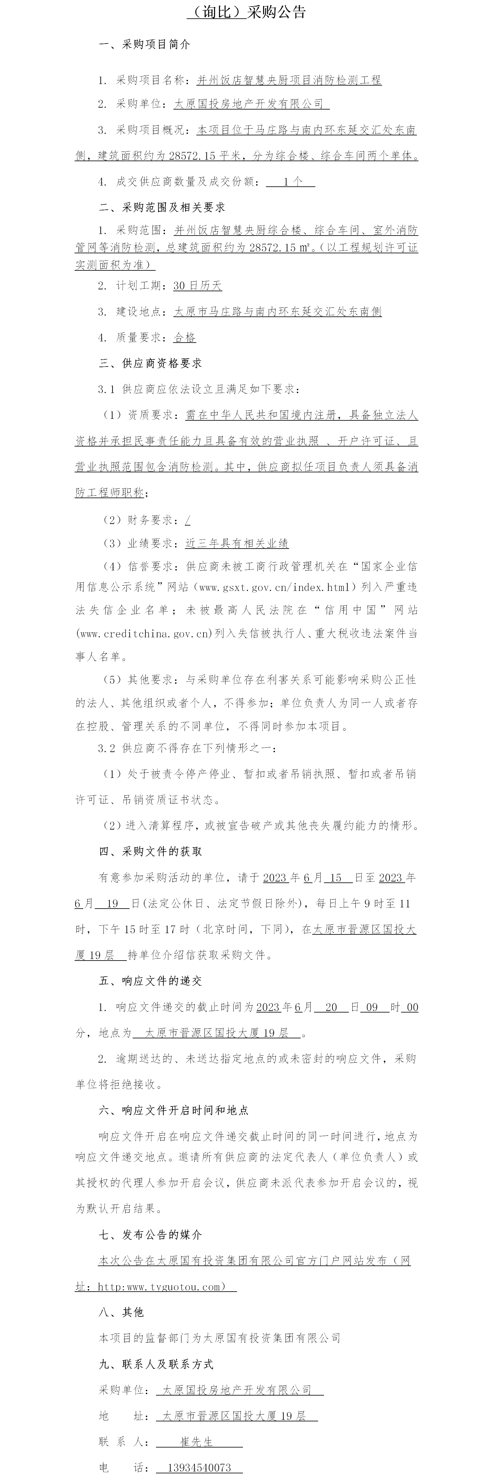 并州飯店智慧央廚消防檢測(詢比)采購公告