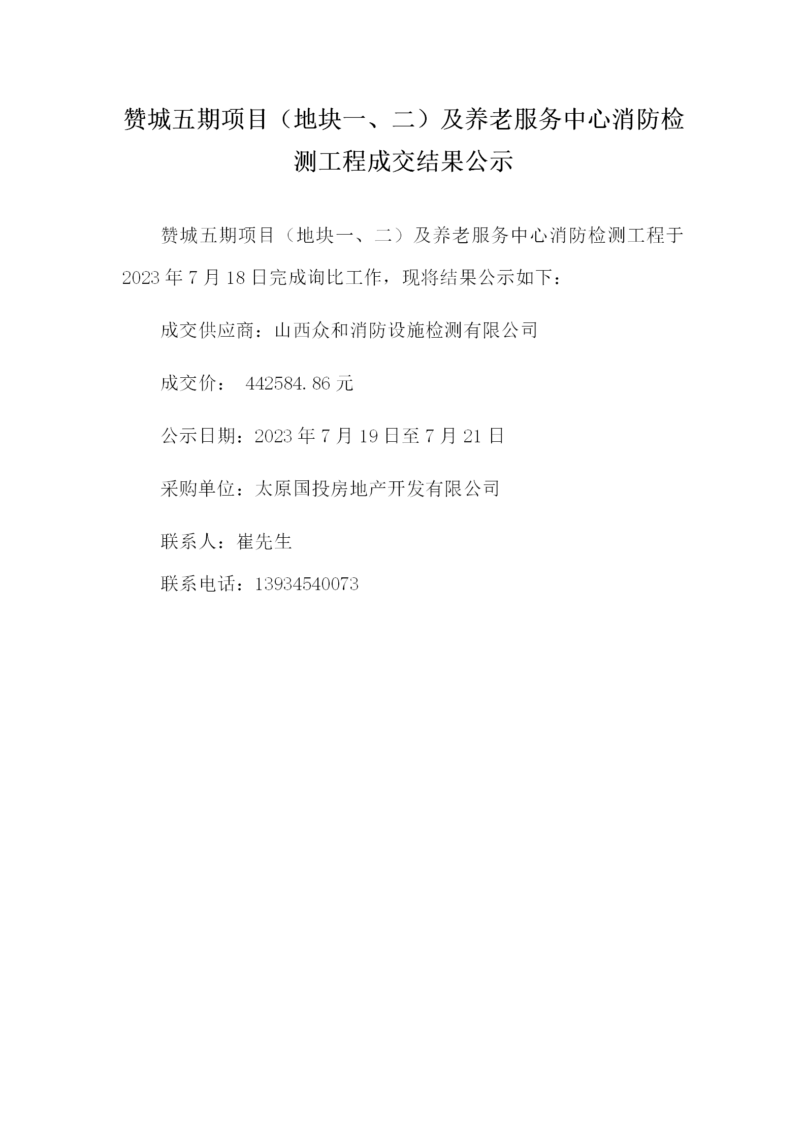 贊城五期項(xiàng)目(地塊一、二)及養(yǎng)老服務(wù)中心消防檢測成交結(jié)果公示