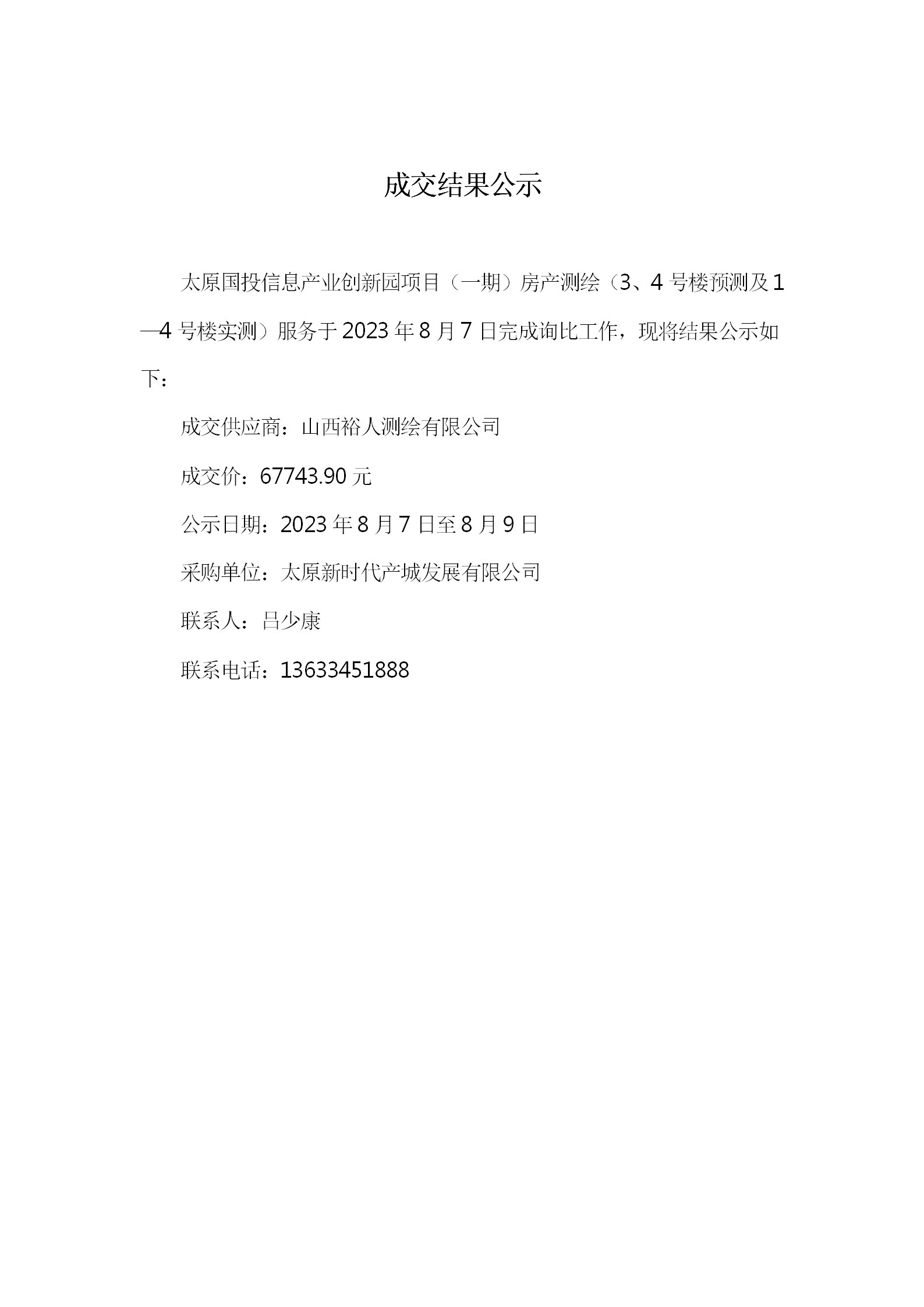 太原國投信息產(chǎn)業(yè)創(chuàng)新園項(xiàng)目(一期)房產(chǎn)測繪(3、4號樓預(yù)測及1-4號樓實(shí)測)服務(wù)采購詢比成交結(jié)果公示