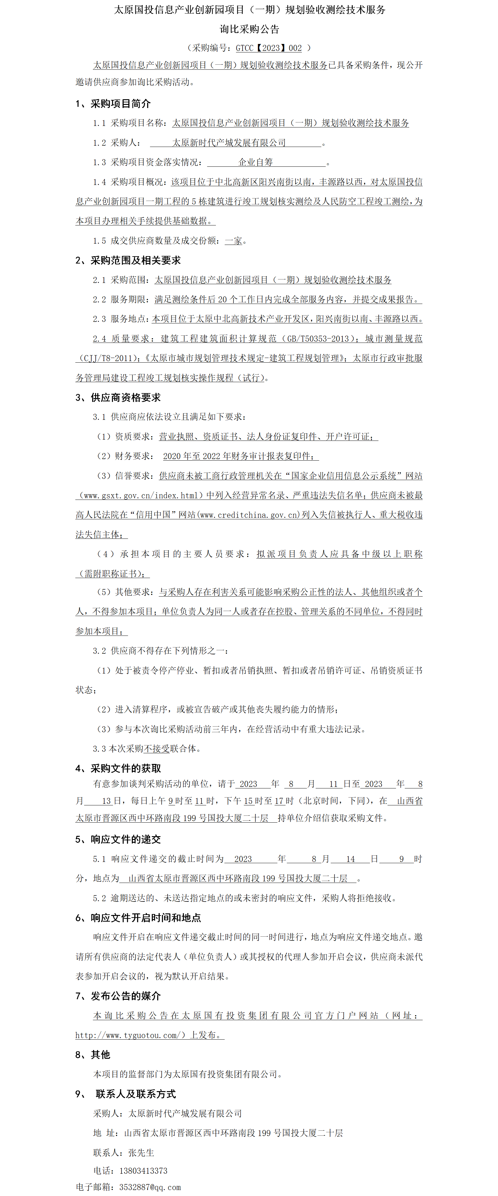 太原國(guó)投信息產(chǎn)業(yè)創(chuàng)新園項(xiàng)目(一期)規(guī)劃驗(yàn)收測(cè)繪技術(shù)服務(wù) 詢比采購(gòu)公告