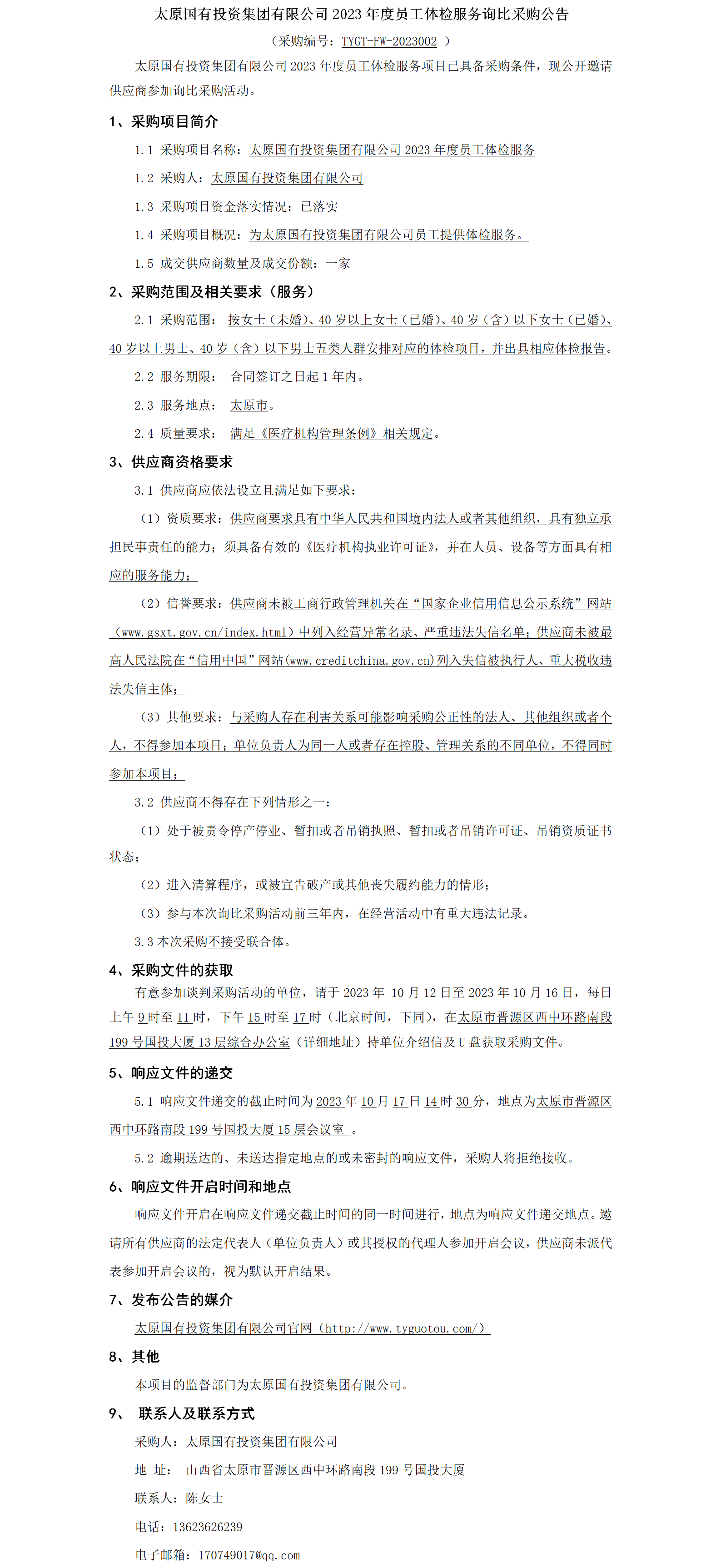 太原國(guó)有投資集團(tuán)有限公司2023年度員工體檢服務(wù)項(xiàng)目詢比采購公告