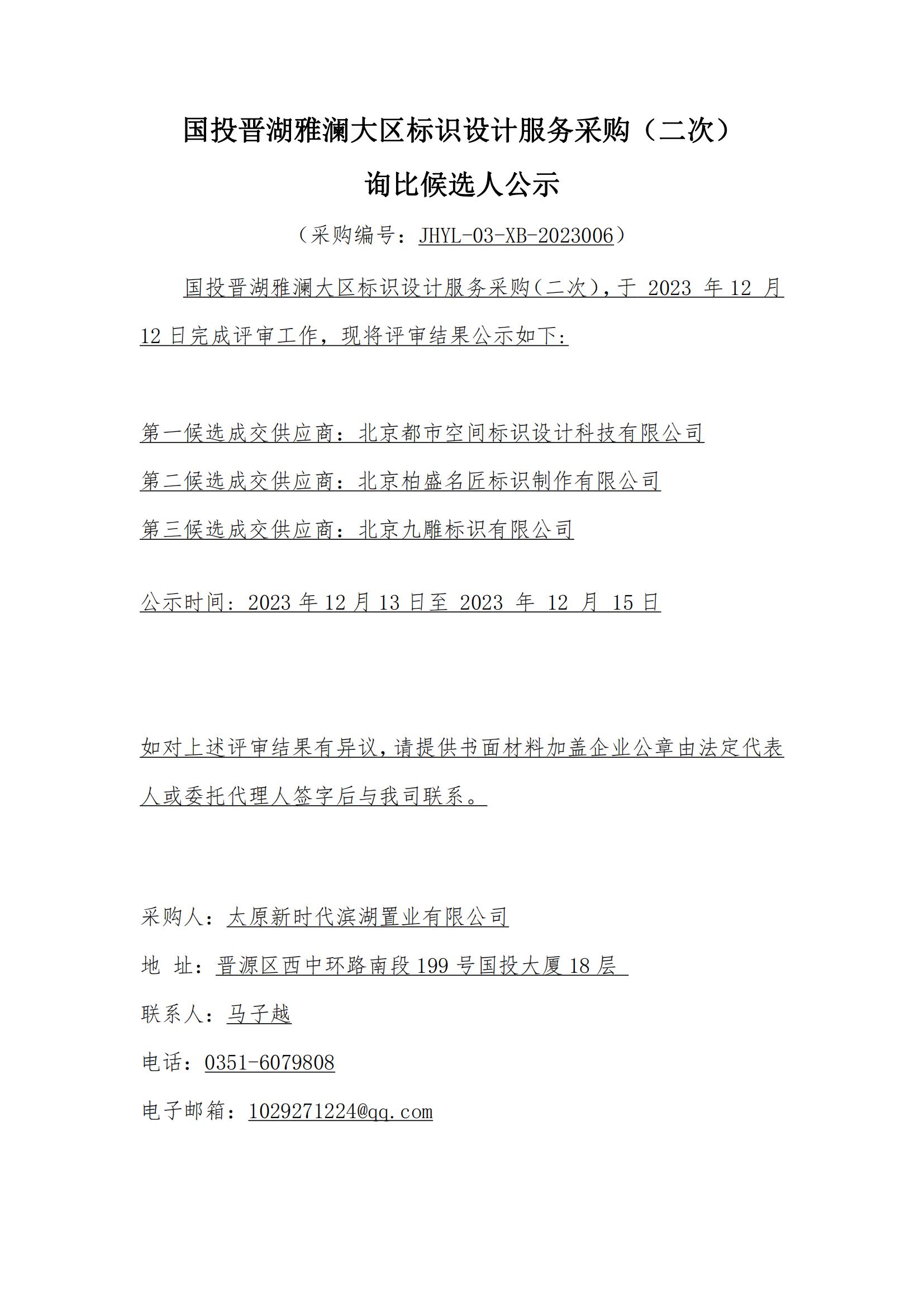 國投晉湖雅瀾大區(qū)標識設計服務采購(二次)詢比候選人公示