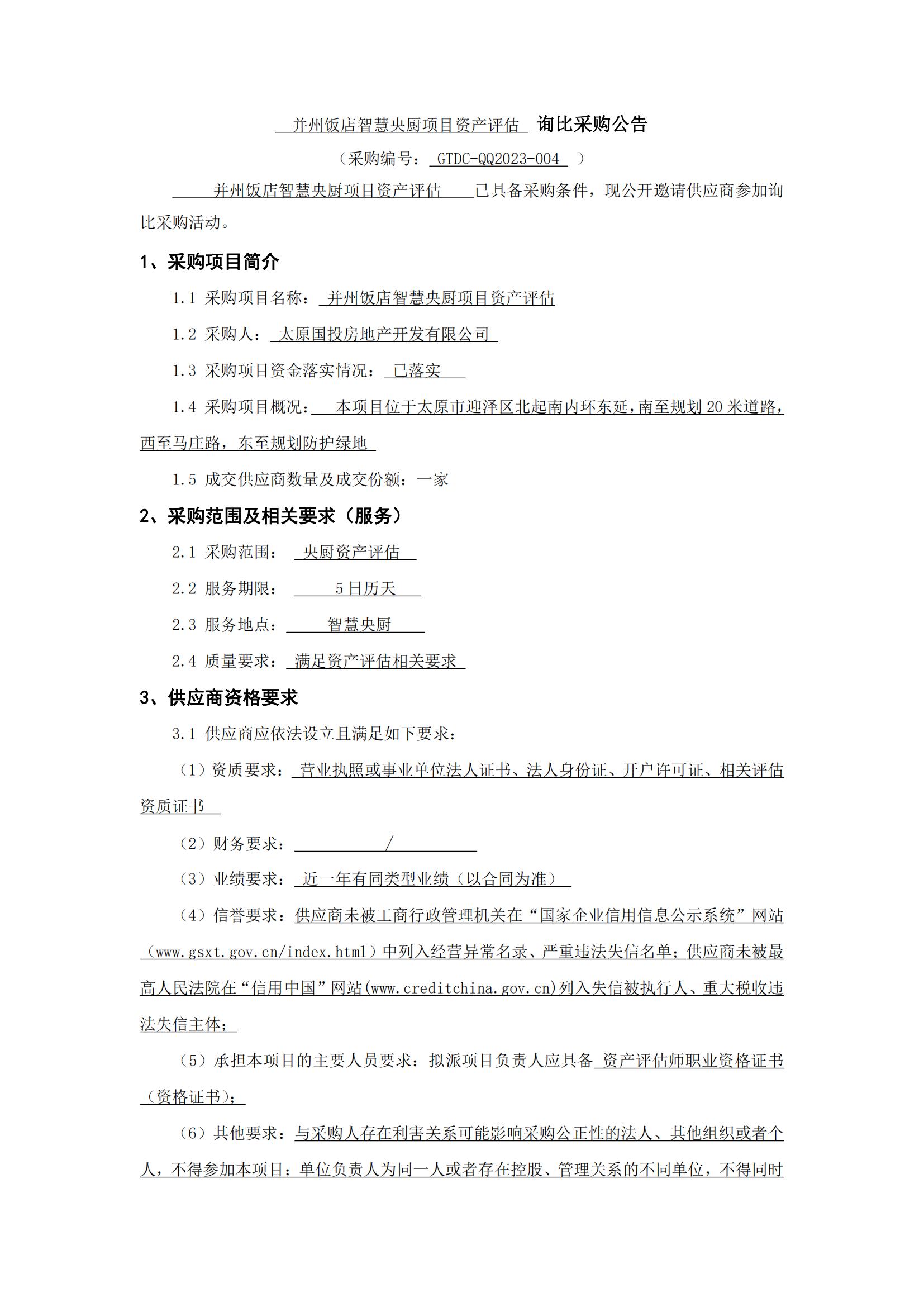 并州飯店智慧央廚項(xiàng)目資產(chǎn)評(píng)估 詢比采購公告