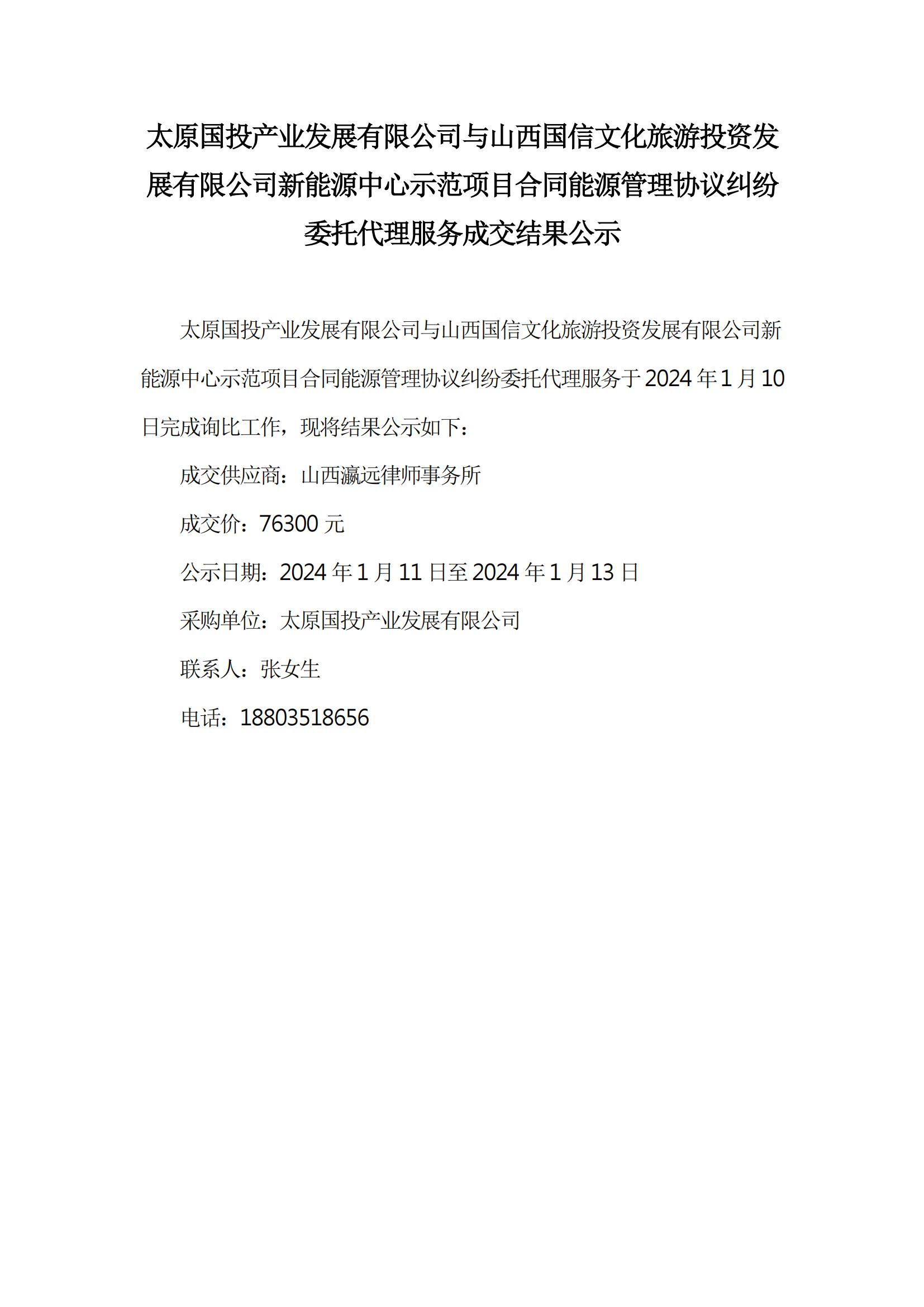 太原國投產業(yè)發(fā)展有限公司與山西國信文化旅游投資發(fā)展有限公司新能源中心示范項目合同能源管理協(xié)議糾紛委托代理成交結果公示