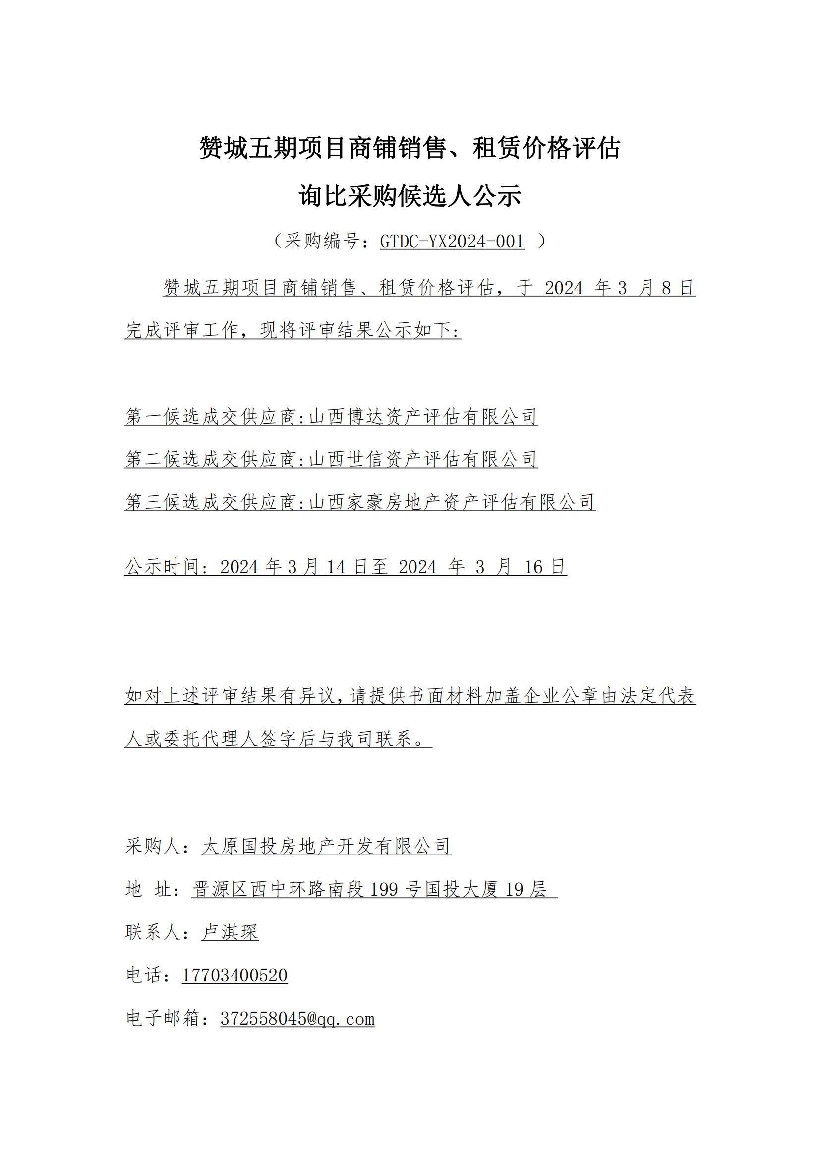 贊城五期項(xiàng)目商鋪銷售、租賃價(jià)格評(píng)估詢比采購(gòu)候選人公示