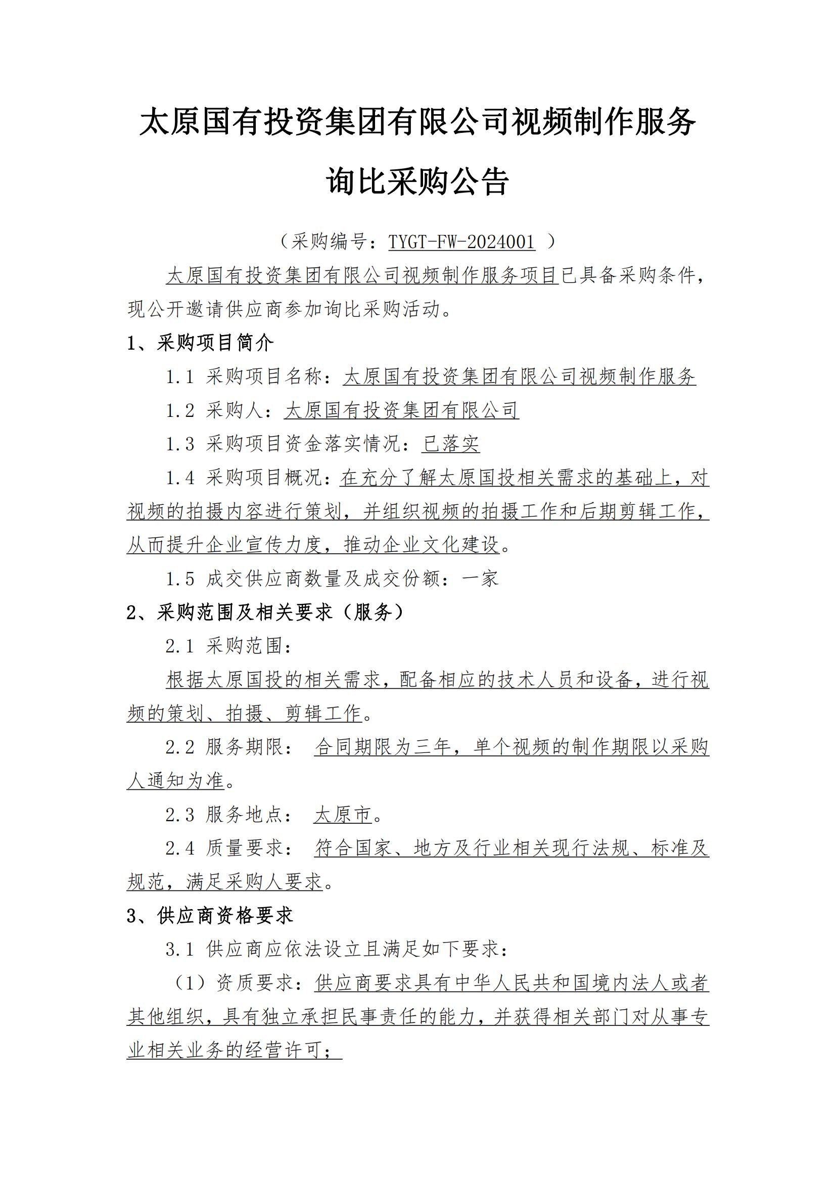 太原國有投資集團(tuán)有限公司視頻制作服務(wù)詢比采購公告