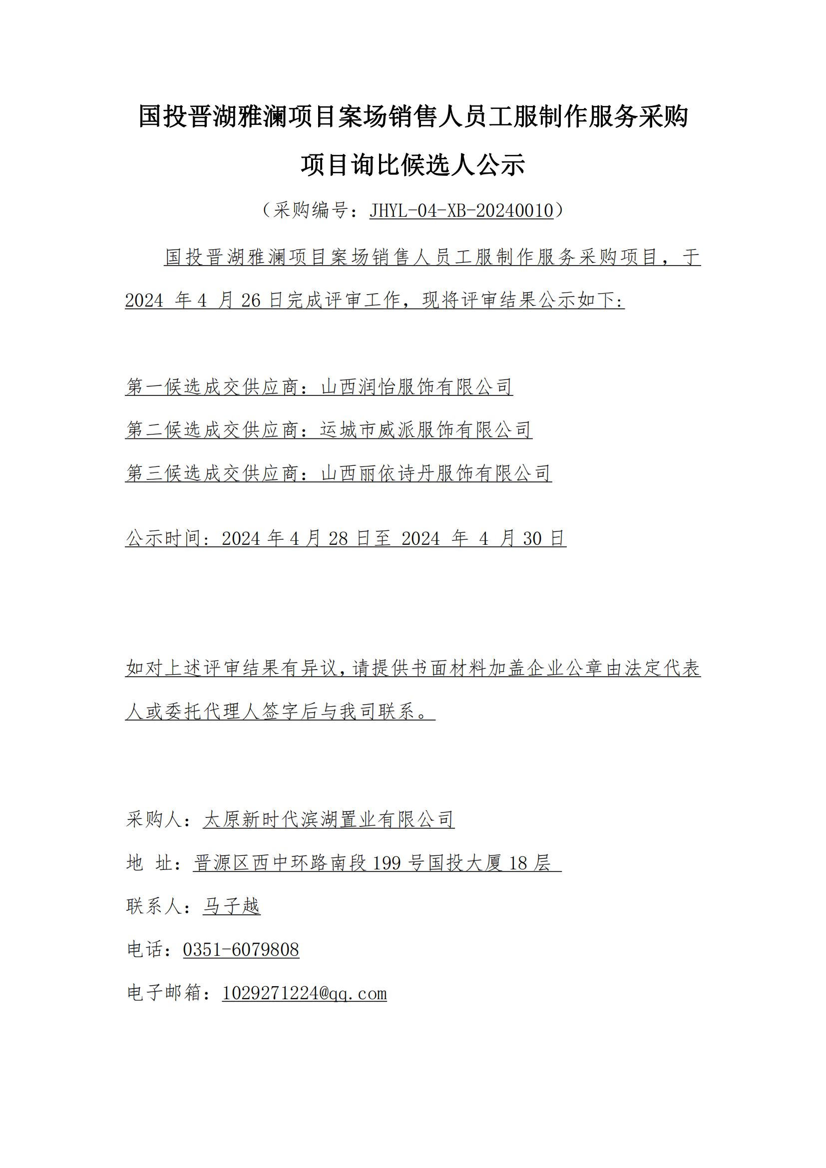 國投晉湖雅瀾項目案場銷售人員工服制作服務采購項目詢比候選人公示