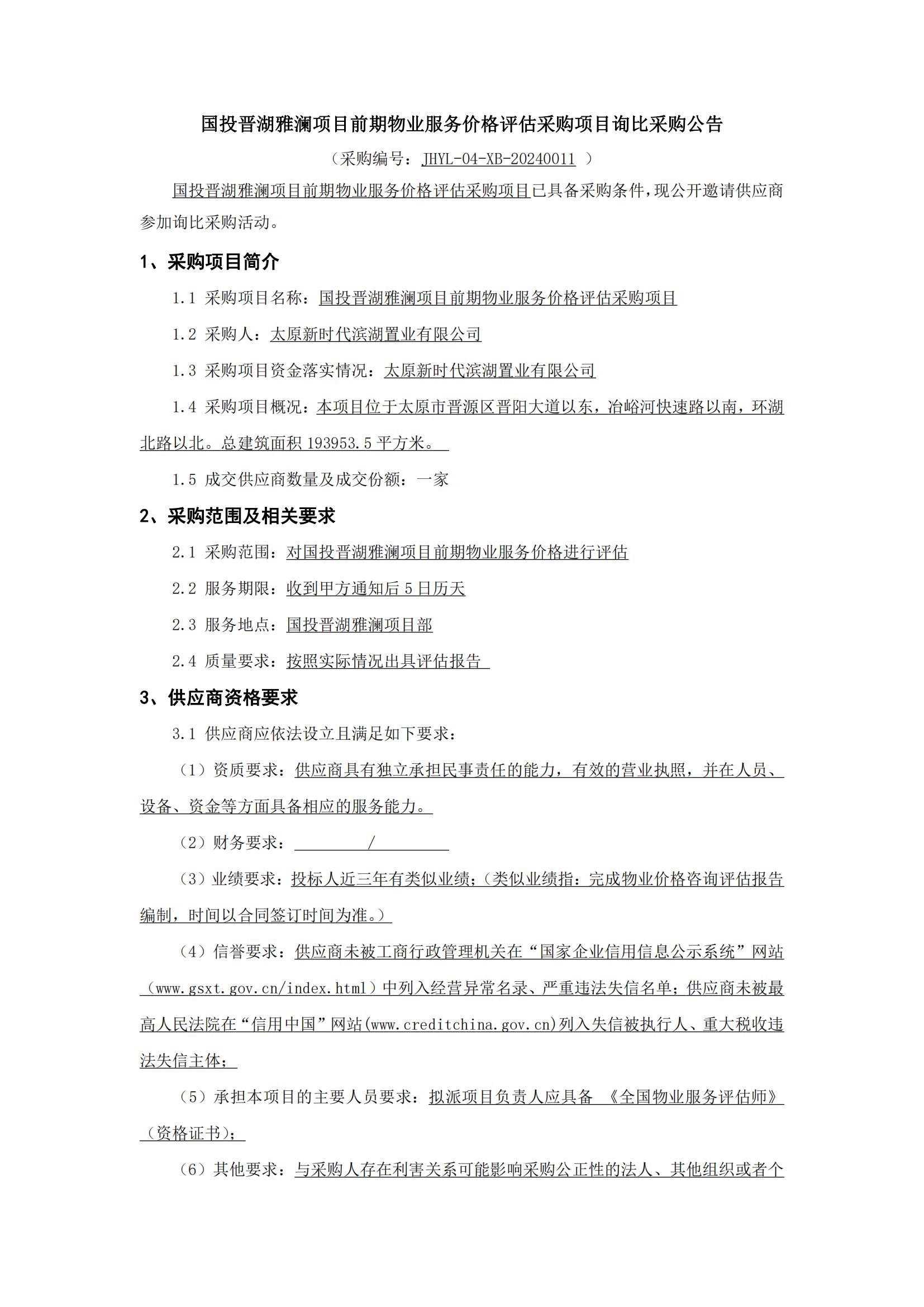 國投晉湖雅瀾項目前期物業(yè)服務價格評估采購項目詢比采購公告