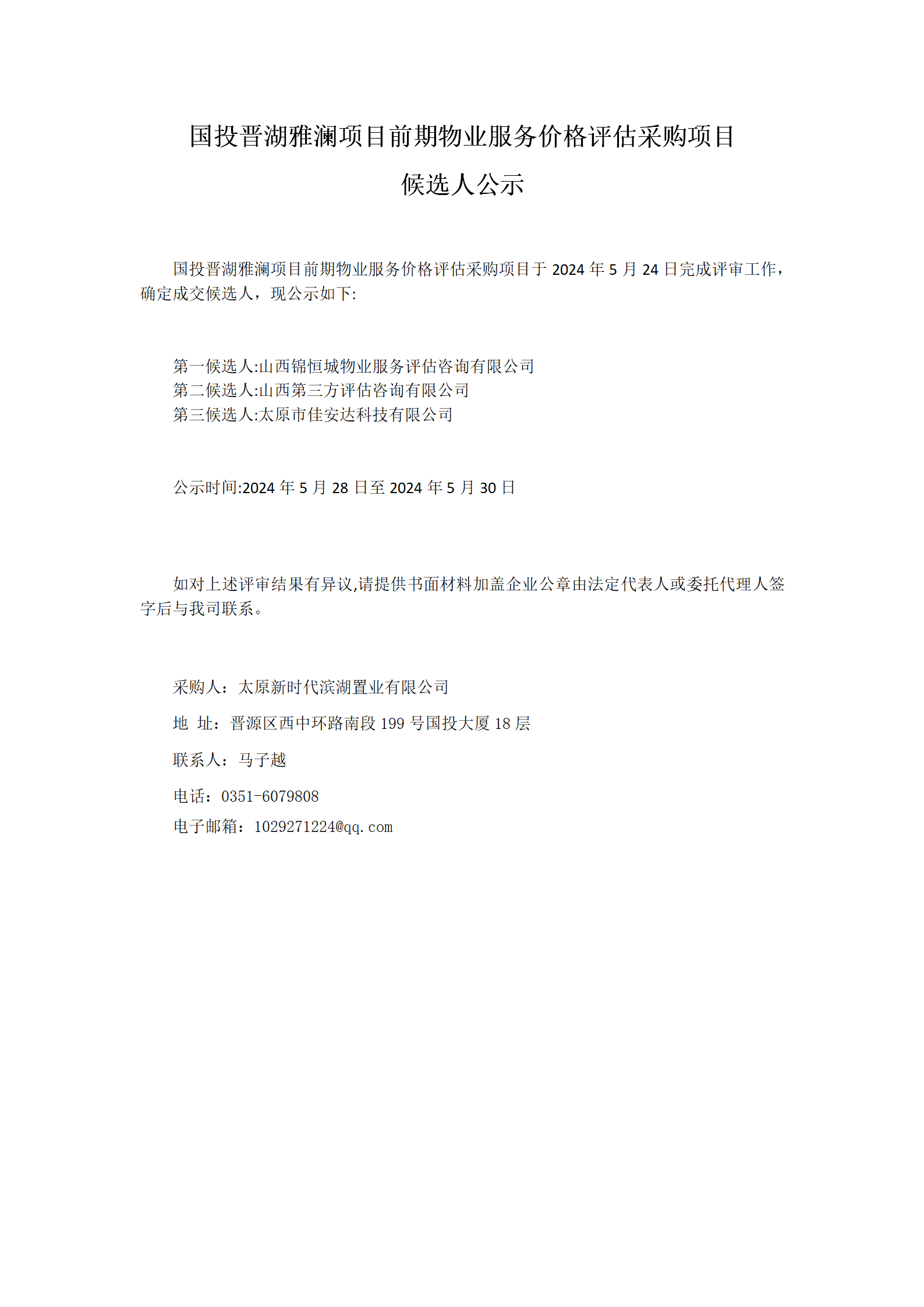 國投晉湖雅瀾項(xiàng)目前期物業(yè)服務(wù)價(jià)格評估采購項(xiàng)目候選人公示