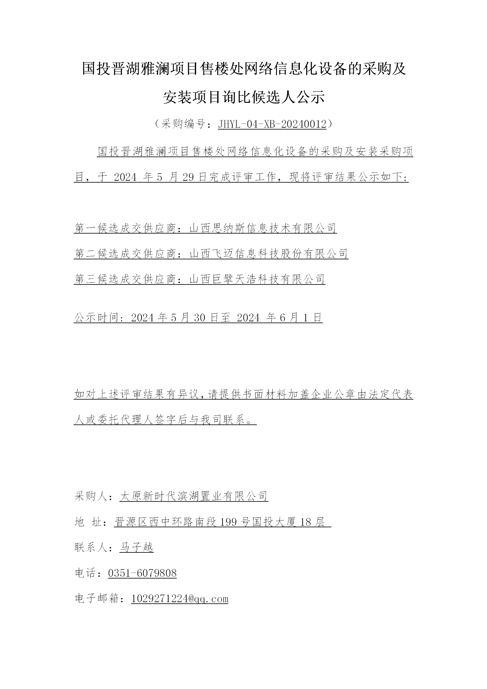 國投晉湖雅瀾項目售樓處網(wǎng)絡(luò)信息化設(shè)備的采購及安裝項目詢比候選人公示
