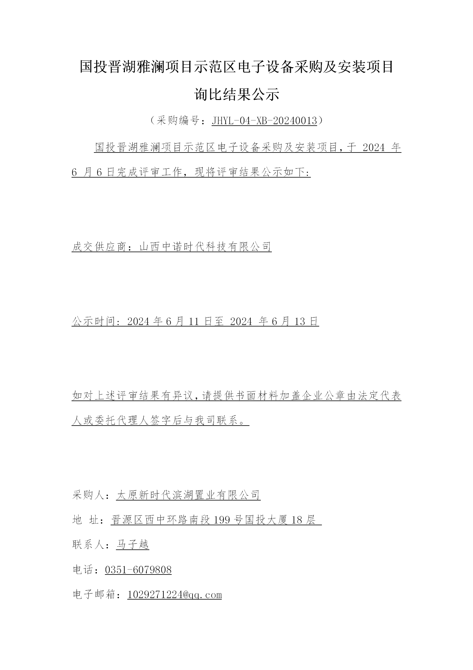 國投晉湖雅瀾項目示范區(qū)電子設(shè)備采購及安裝項目詢比結(jié)果公示