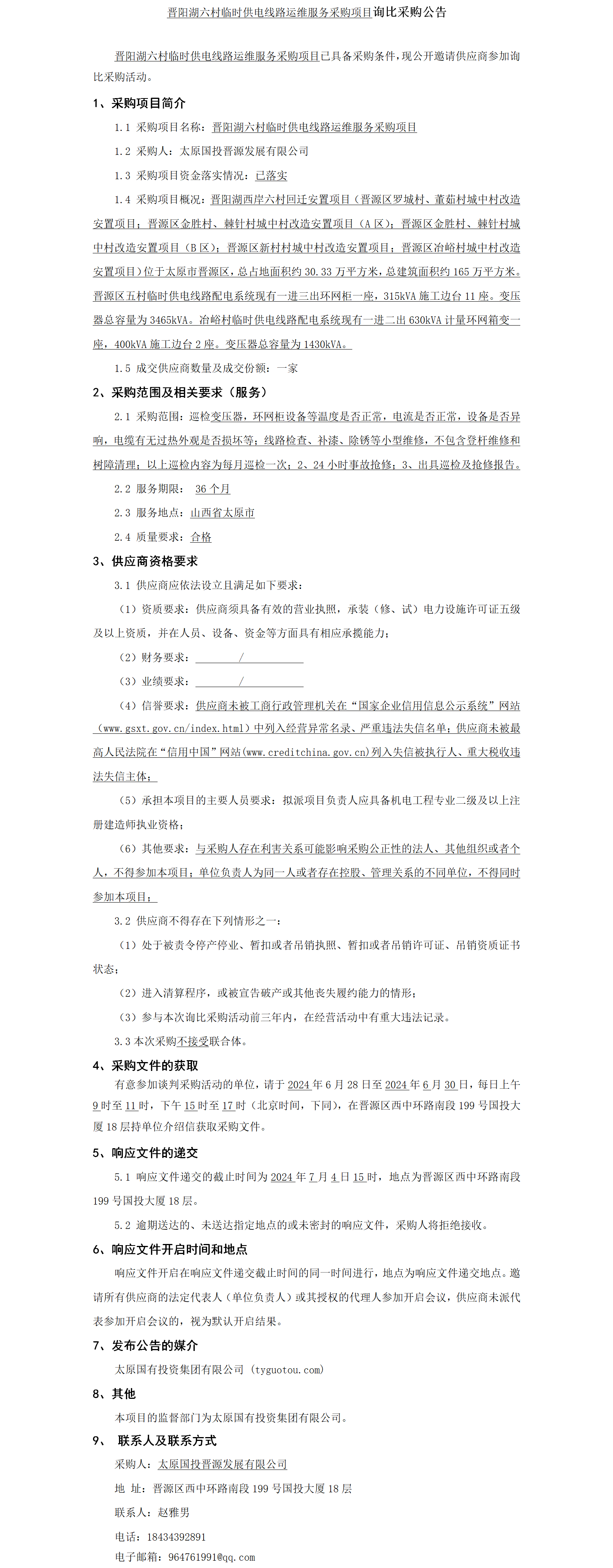 晉陽湖六村臨時(shí)供電線路運(yùn)維服務(wù)采購項(xiàng)目詢比采購公告