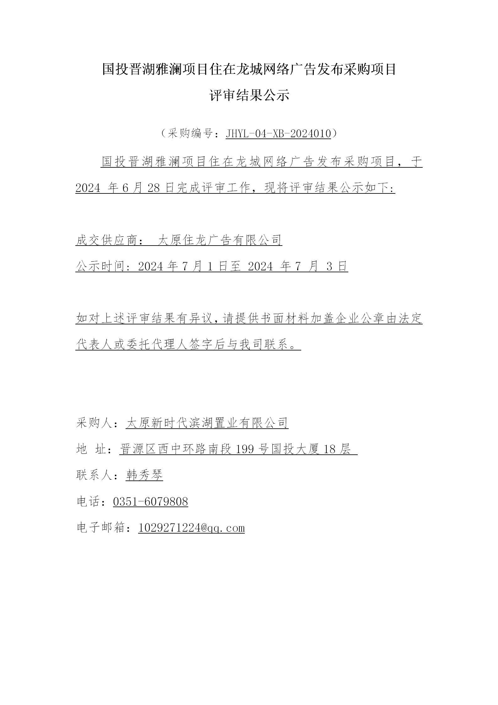 晉湖雅瀾項(xiàng)目住在龍城網(wǎng)絡(luò)廣告發(fā)布采購項(xiàng)目評審結(jié)果公示