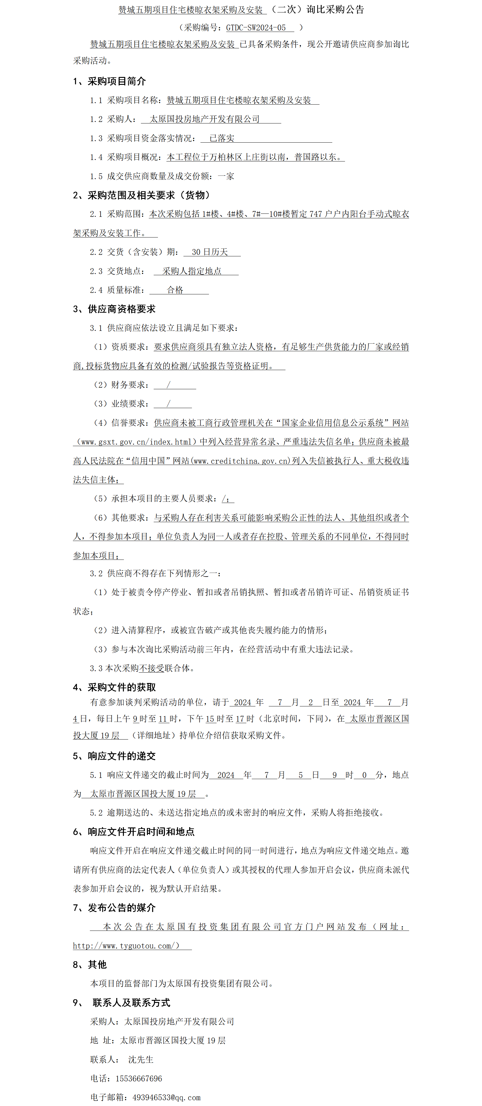 贊城五期項(xiàng)目住宅樓晾衣架采購(gòu)及安裝(二次)詢比采購(gòu)公告