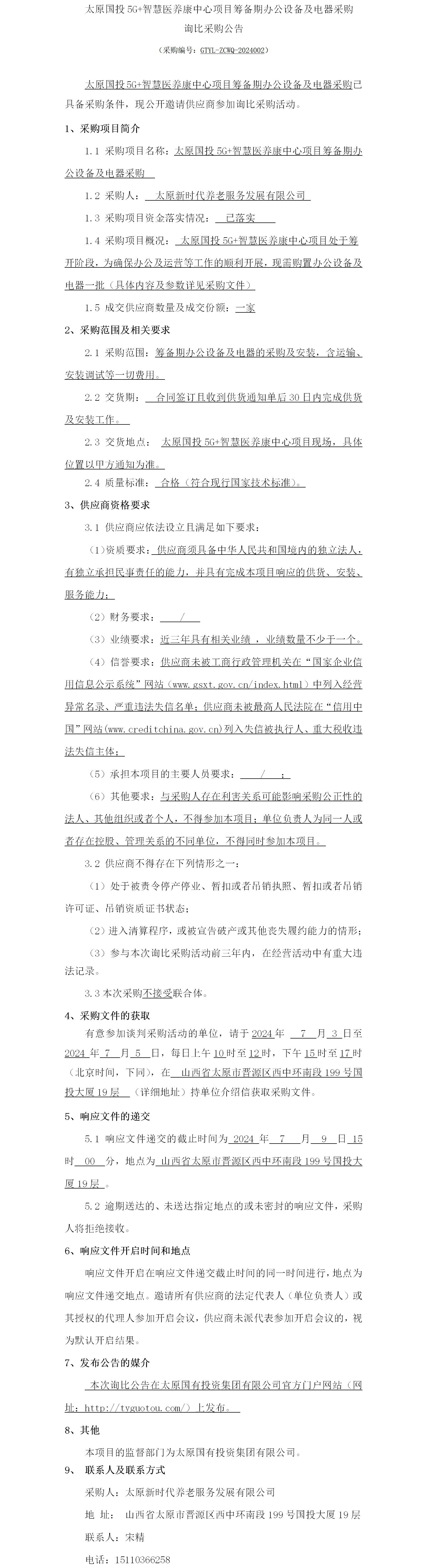 太原國(guó)投5G+智慧醫(yī)養(yǎng)康中心項(xiàng)目籌備期辦公設(shè)備及電器采購(gòu)詢比采購(gòu)公告