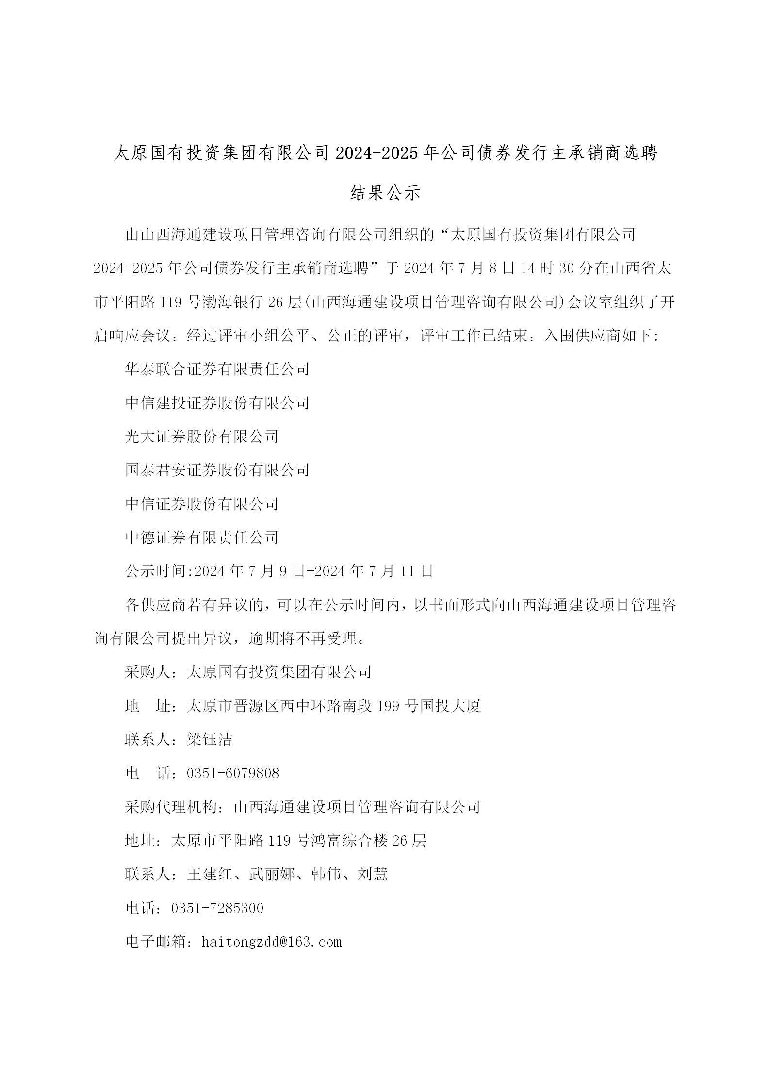 太原國(guó)有投資集團(tuán)有限公司2024-2025年公司債券發(fā)行主承銷商選聘結(jié)果公示