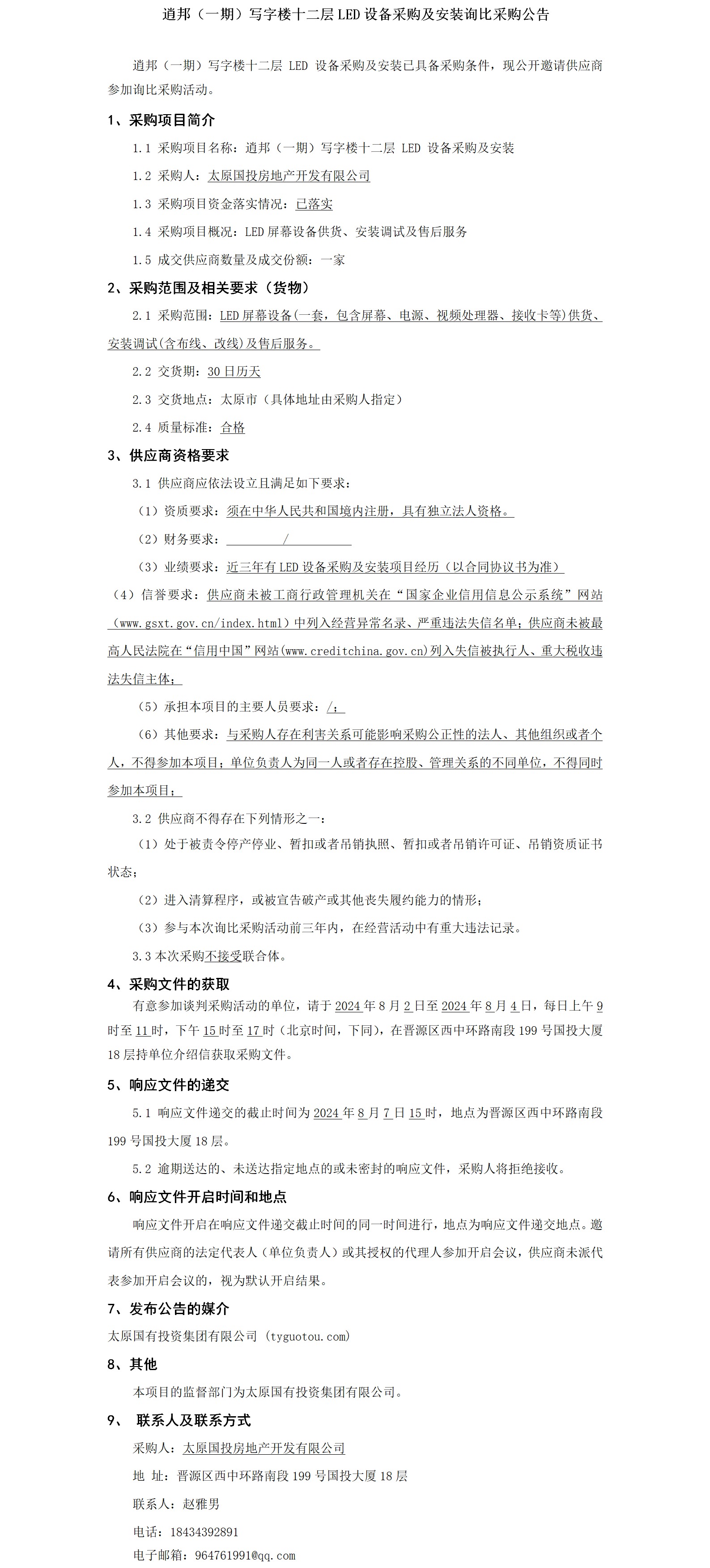 逍邦(一期)寫(xiě)字樓十二層LED設(shè)備采購(gòu)及安裝詢比采購(gòu)公告