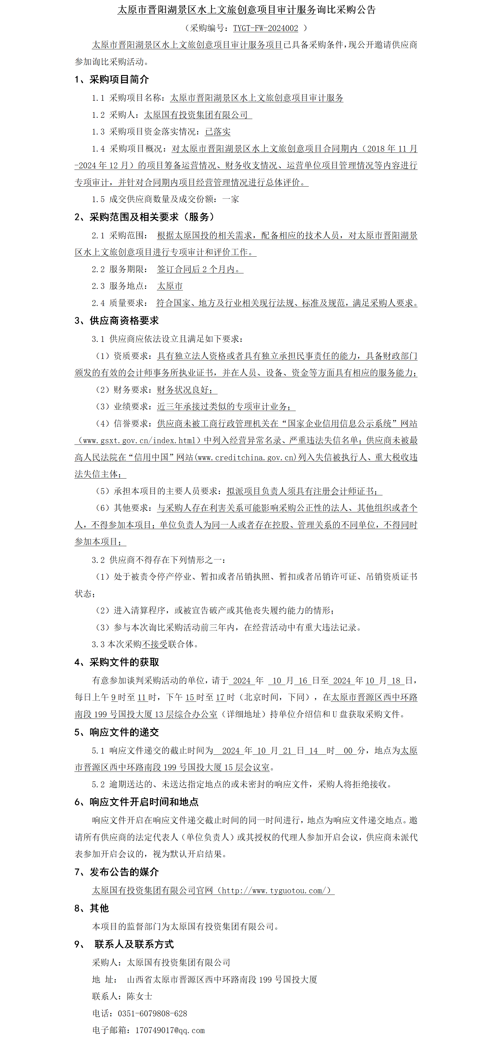 太原市晉陽湖景區(qū)水上文旅創(chuàng)意項(xiàng)目審計(jì)服務(wù)詢比采購公告