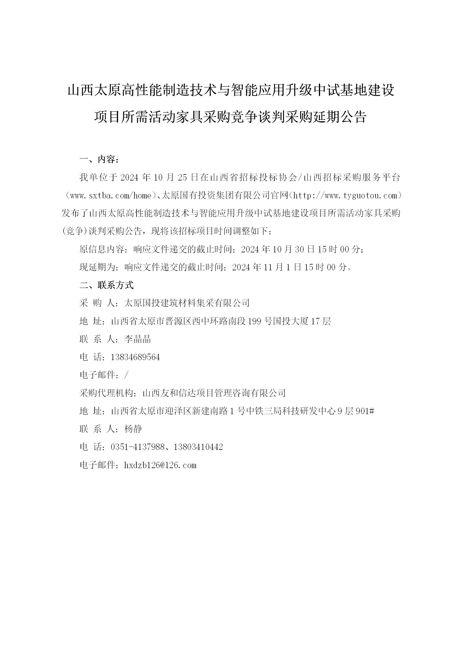 山西太原高性能制造技術(shù)與智能應(yīng)用升級(jí)中試基地建設(shè)項(xiàng)目所需活動(dòng)家具采購(gòu)競(jìng)爭(zhēng)談判采購(gòu)延期公告