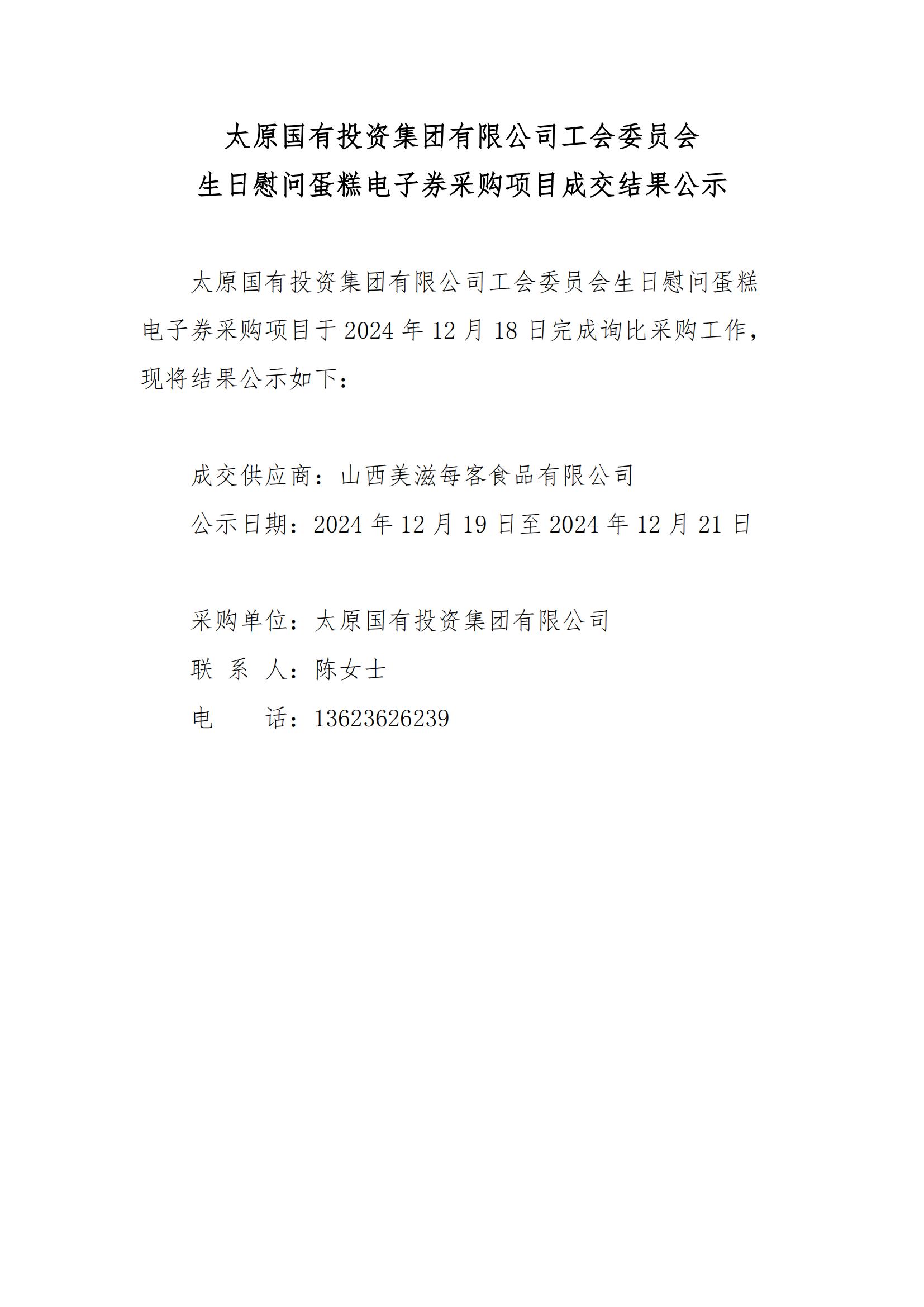 太原國(guó)有投資集團(tuán)有限公司工會(huì)委員會(huì)生日慰問蛋糕電子券采購(gòu)項(xiàng)目成交結(jié)果公示